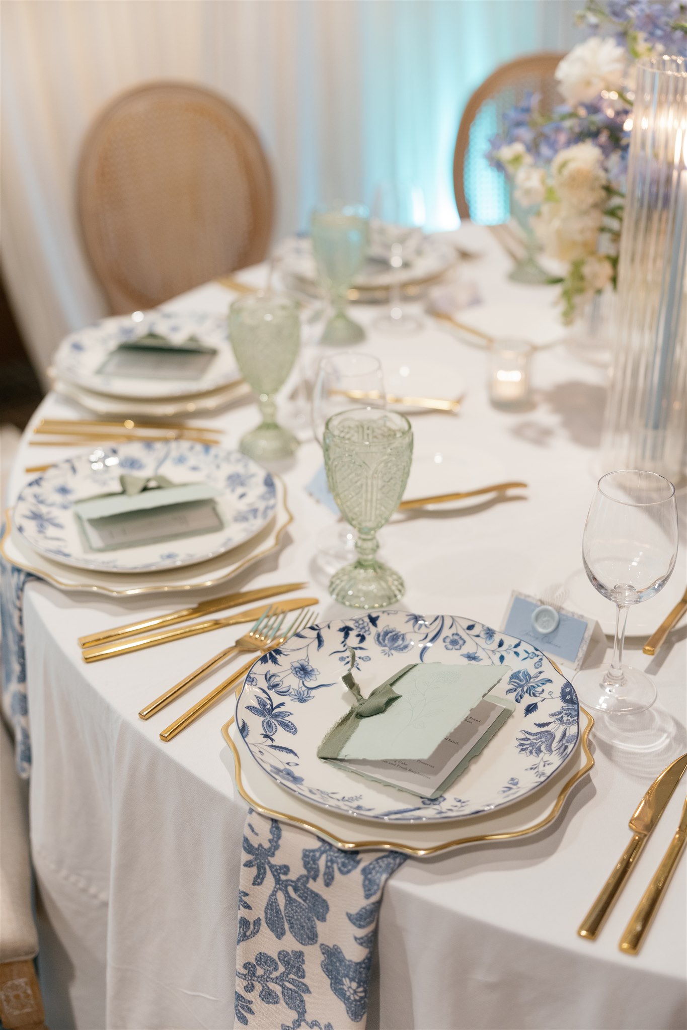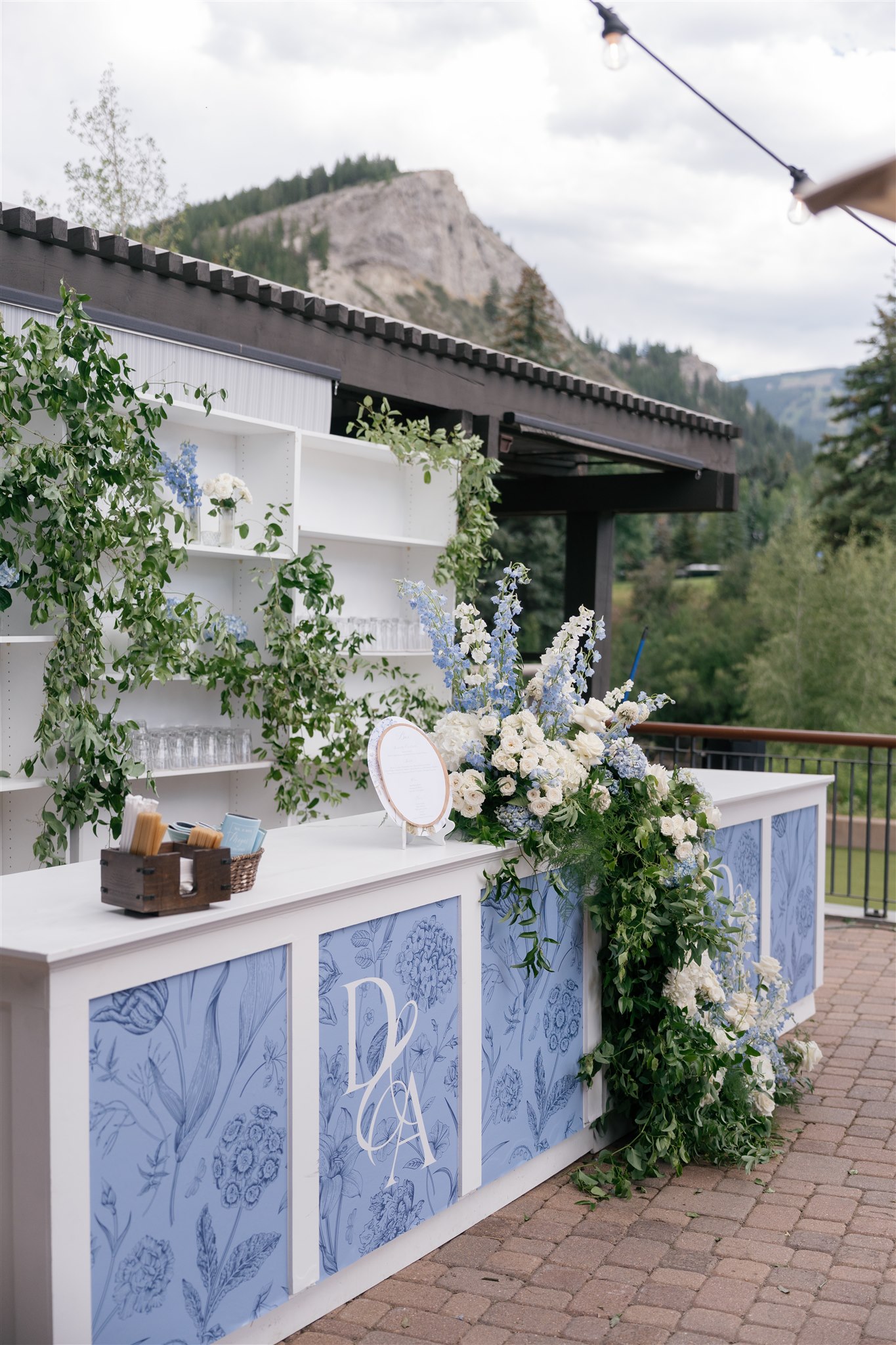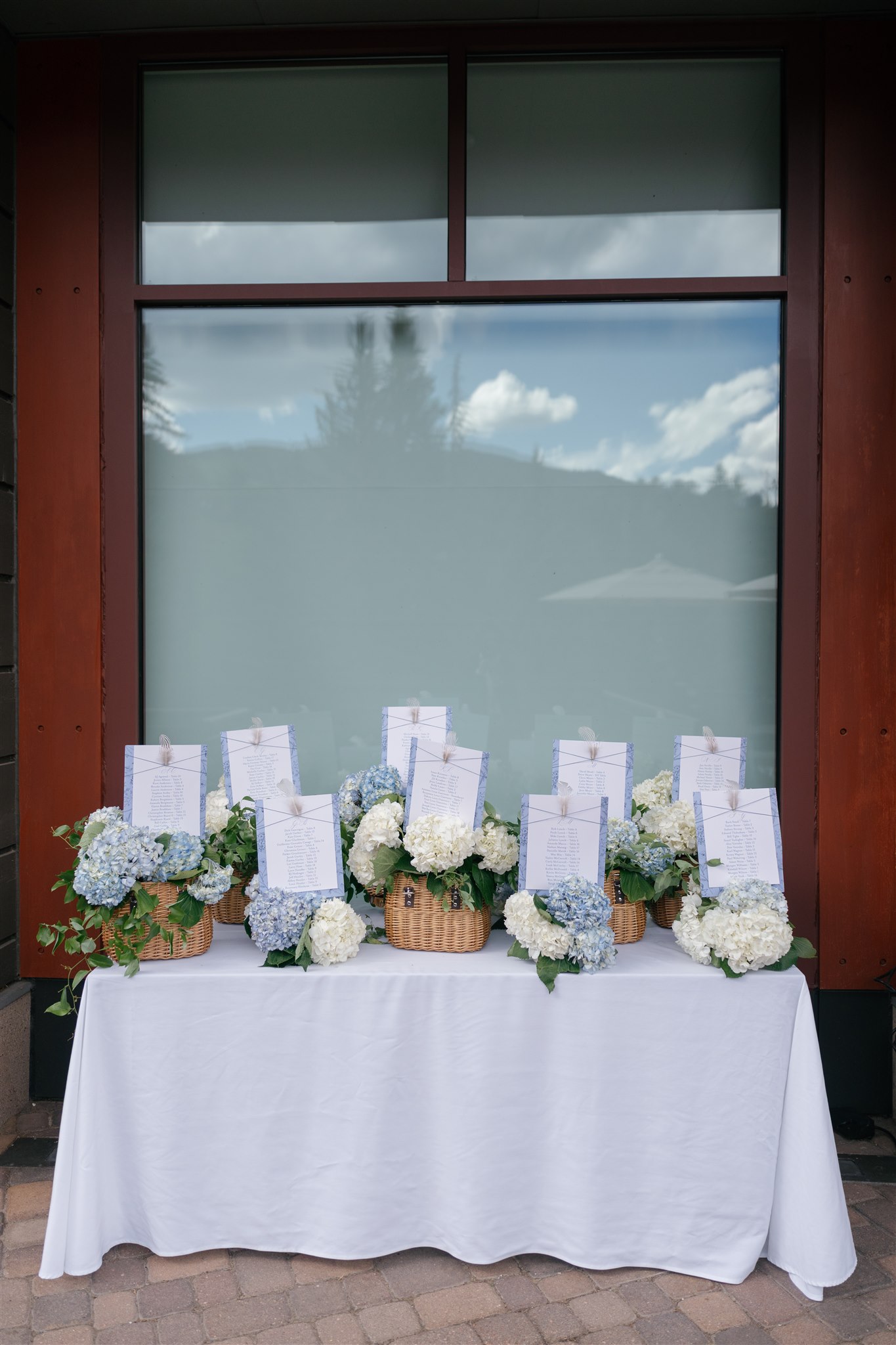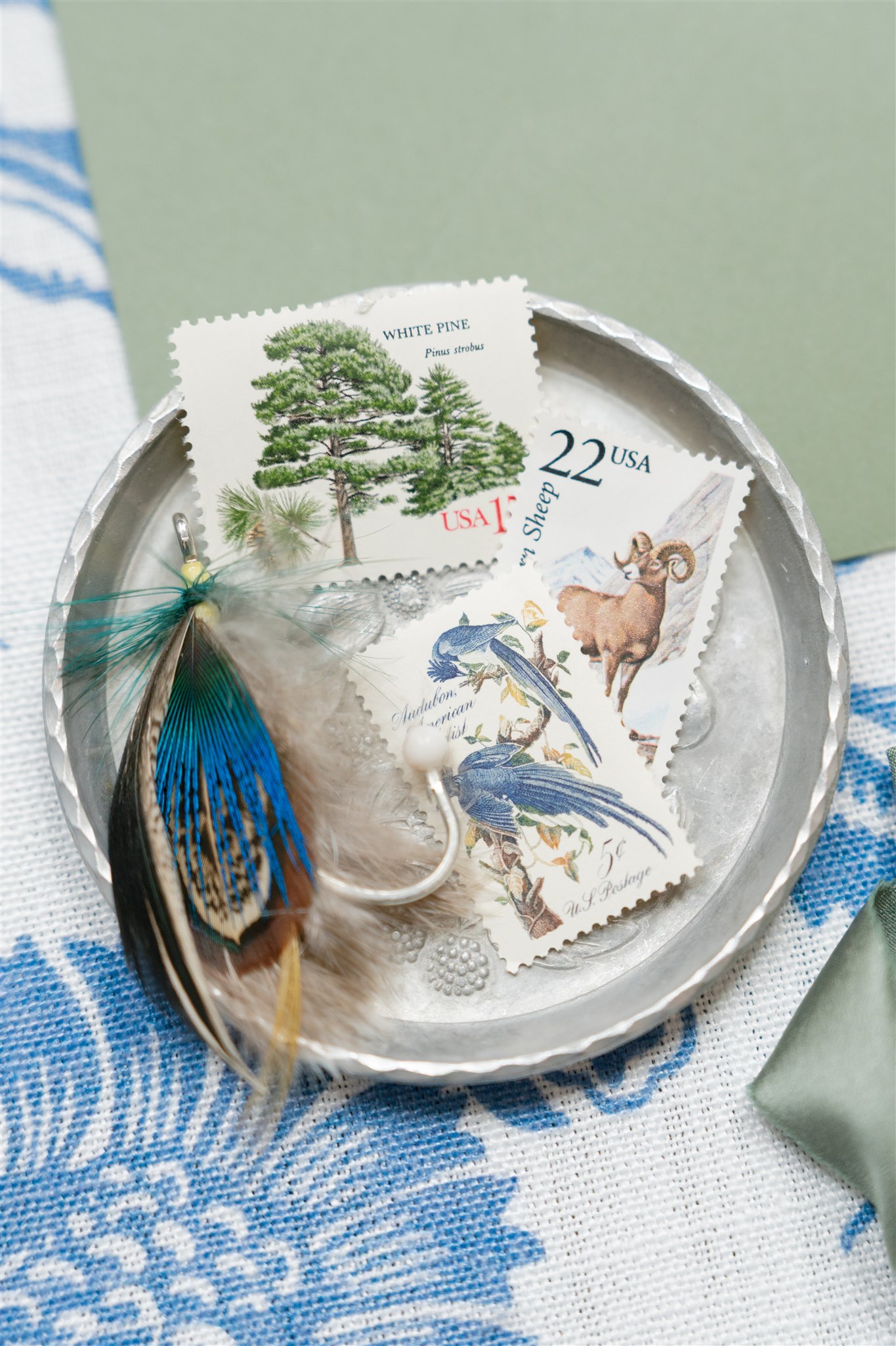 The design featured a classic palette of soft blues and crisp whites, elevated with a playful mix of chinoiserie pots and natural rattan textures. The balance of elegance and earthiness made the space feel both refined and welcoming, a true reflection of Autumn and Drew’s personalities. Every detail felt intentional, from the patterned napkins to the custom prints created by Montana Paper Company, weaving a story of sophistication with a touch of whimsy. Autumn and Drew’s story began with them fly fishing and Drew proposing in the river the runs behind The Westin. Throughout the design, there were subtle nods to this unique part of their story with pheasant feathers and fishing creels to give a personal nod to their story.