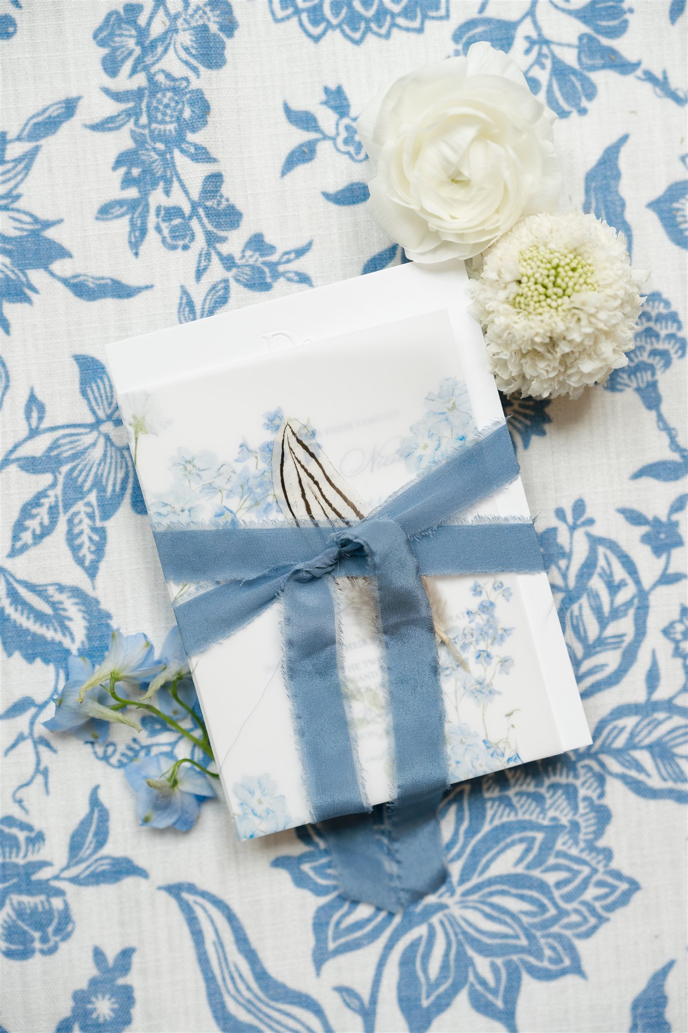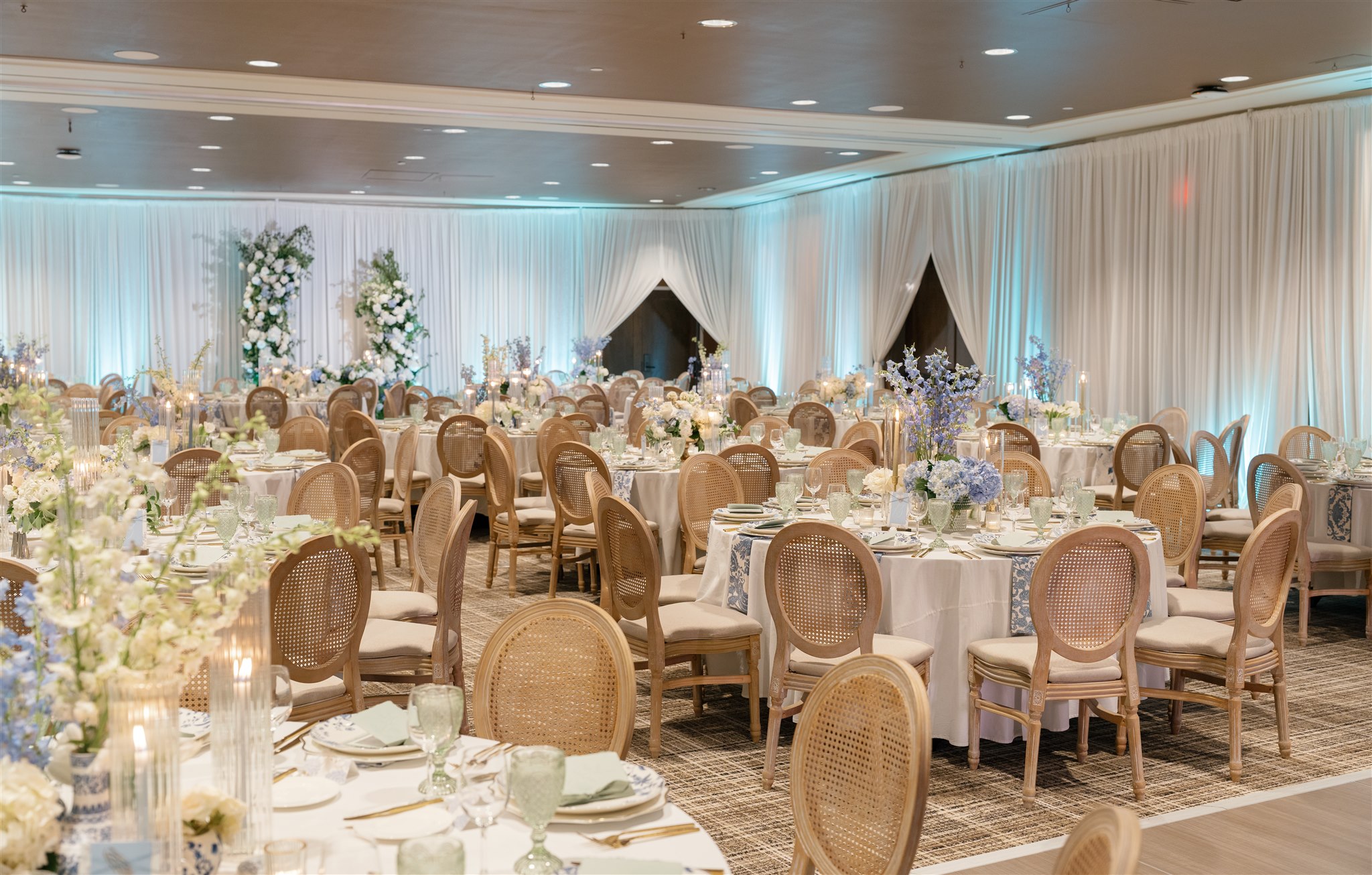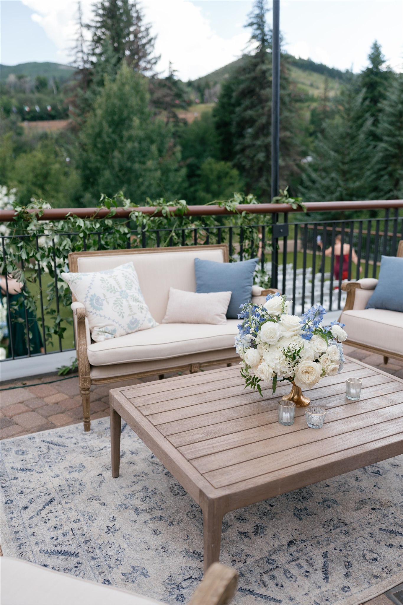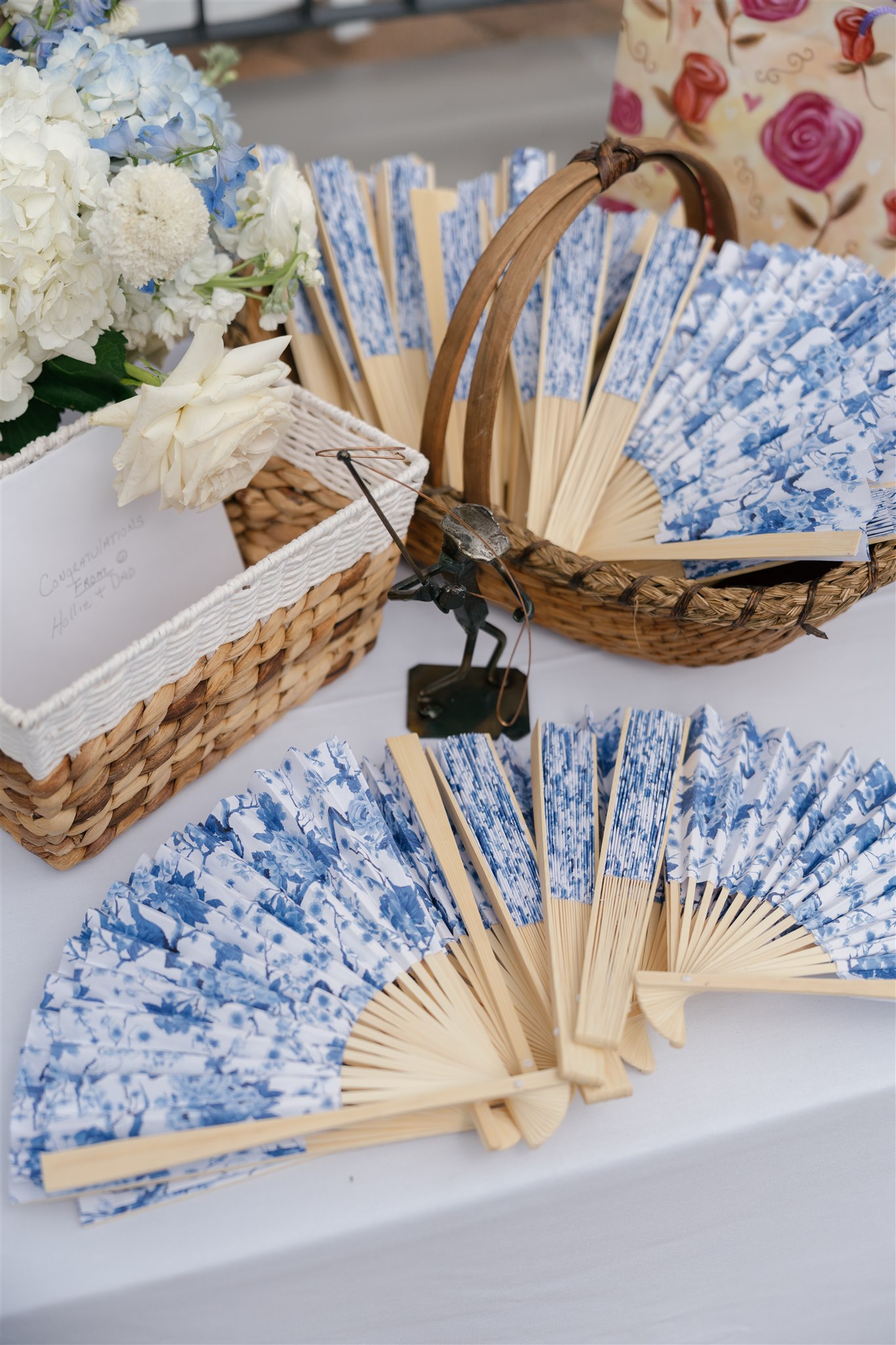 The design featured a classic palette of soft blues and crisp whites, elevated with a playful mix of chinoiserie pots and natural rattan textures. The balance of elegance and earthiness made the space feel both refined and welcoming, a true reflection of Autumn and Drew’s personalities. Every detail felt intentional, from the patterned napkins to the custom prints created by Montana Paper Company, weaving a story of sophistication with a touch of whimsy. Autumn and Drew’s story began with them fly fishing and Drew proposing in the river the runs behind The Westin. Throughout the design, there were subtle nods to this unique part of their story with pheasant feathers and fishing creels to give a personal nod to their story.