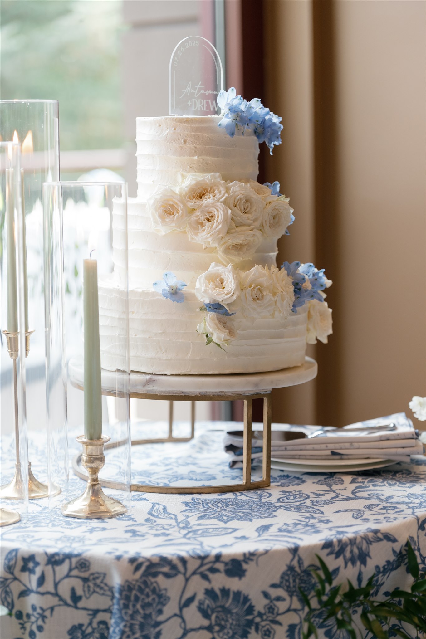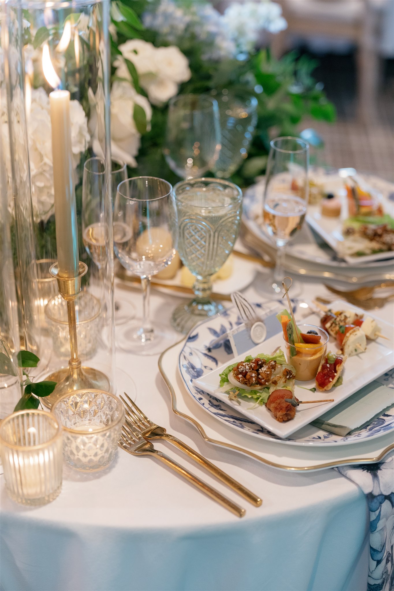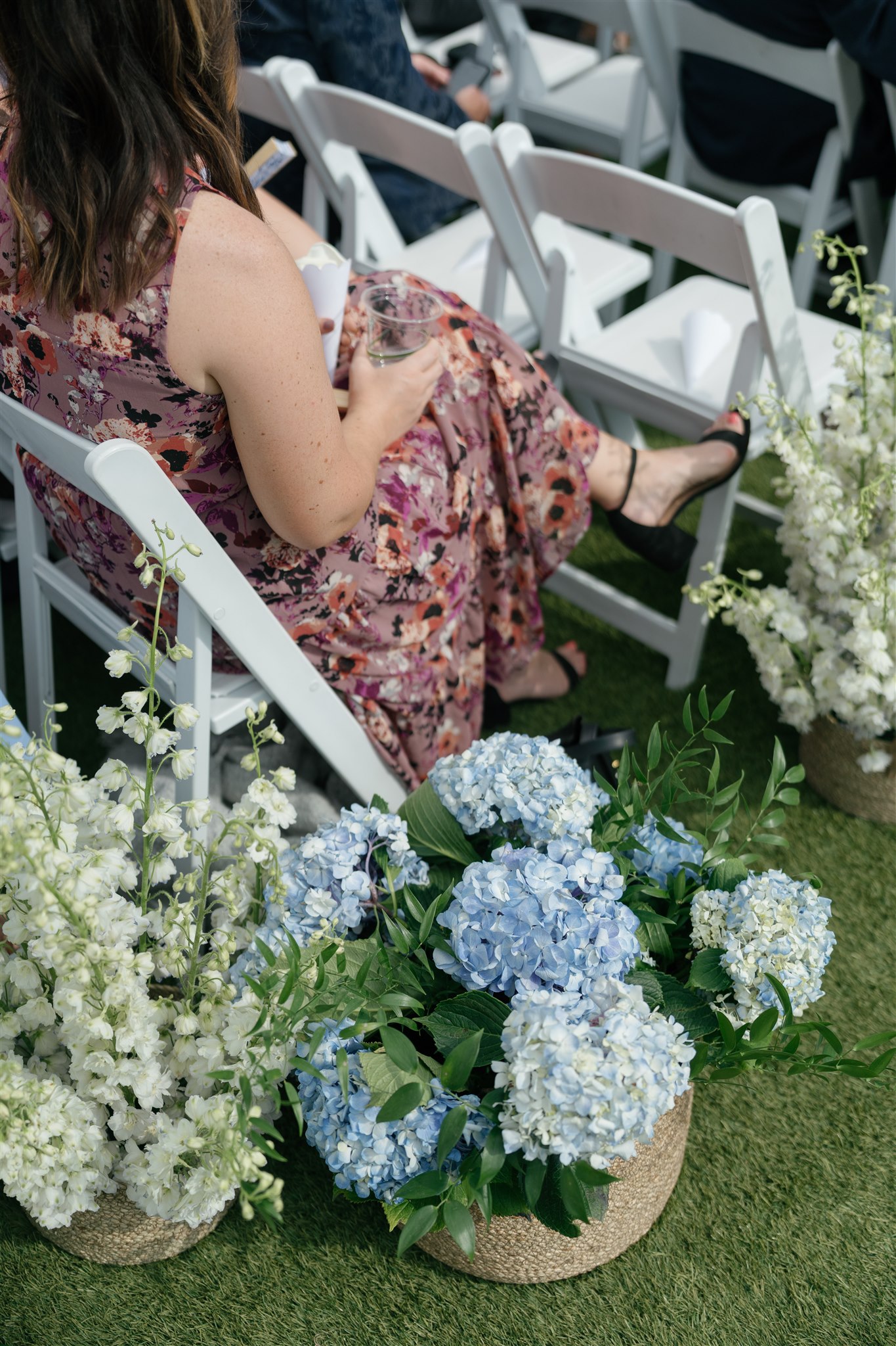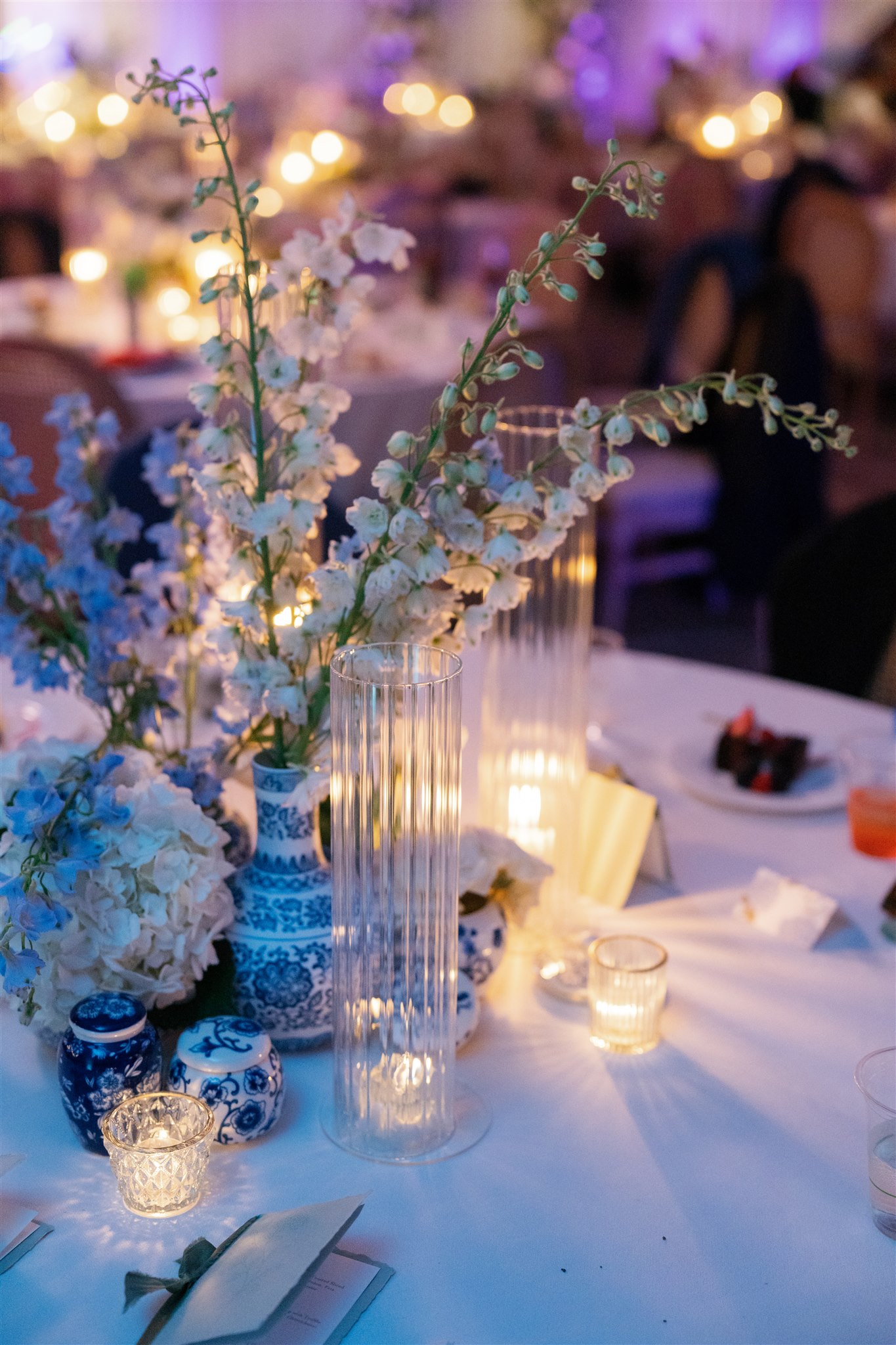 The design featured a classic palette of soft blues and crisp whites, elevated with a playful mix of chinoiserie pots and natural rattan textures. The balance of elegance and earthiness made the space feel both refined and welcoming, a true reflection of Autumn and Drew’s personalities. Every detail felt intentional, from the patterned napkins to the custom prints created by Montana Paper Company, weaving a story of sophistication with a touch of whimsy. Autumn and Drew’s story began with them fly fishing and Drew proposing in the river the runs behind The Westin. Throughout the design, there were subtle nods to this unique part of their story with pheasant feathers and fishing creels to give a personal nod to their story.