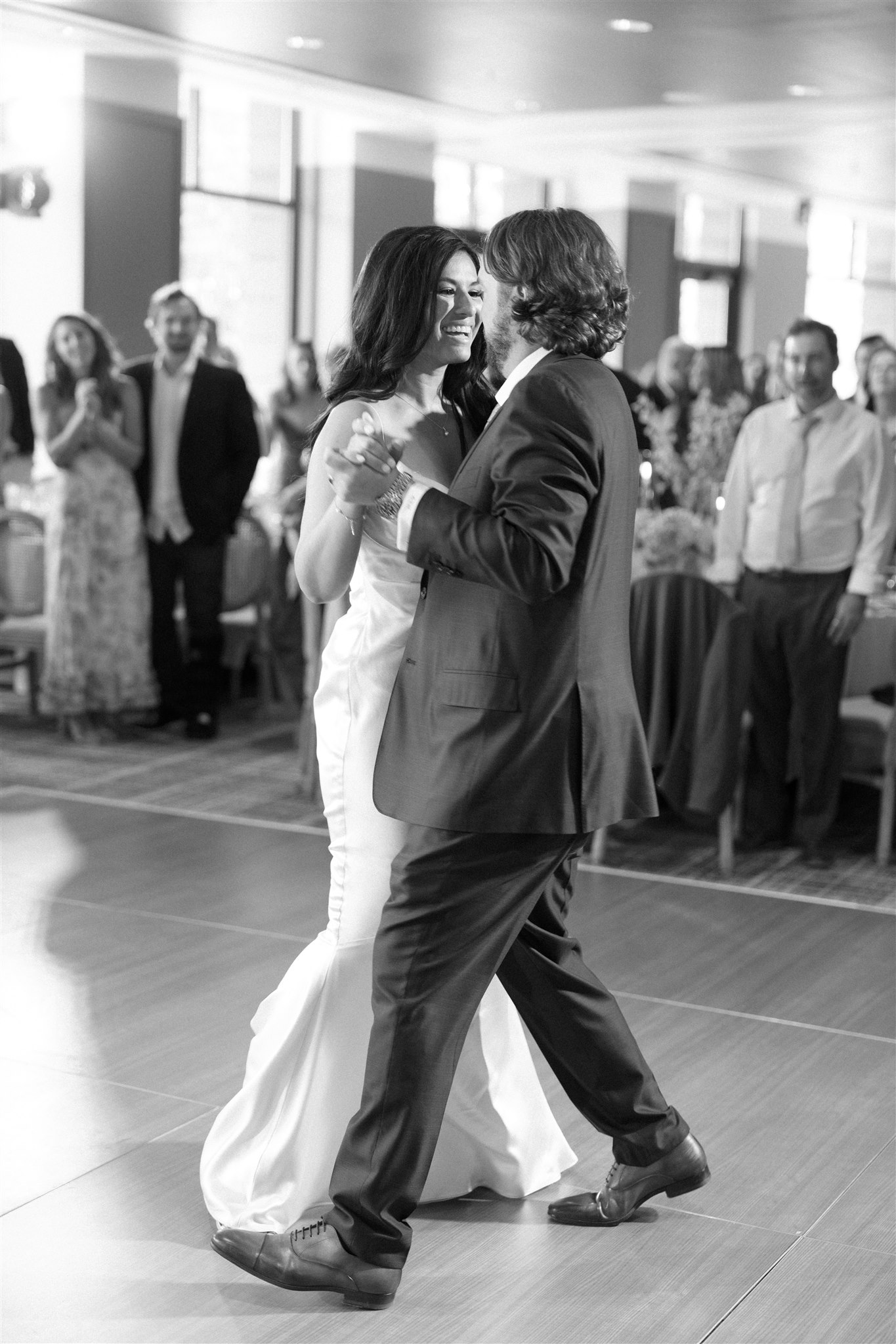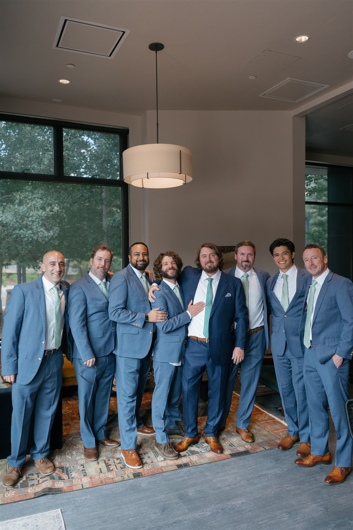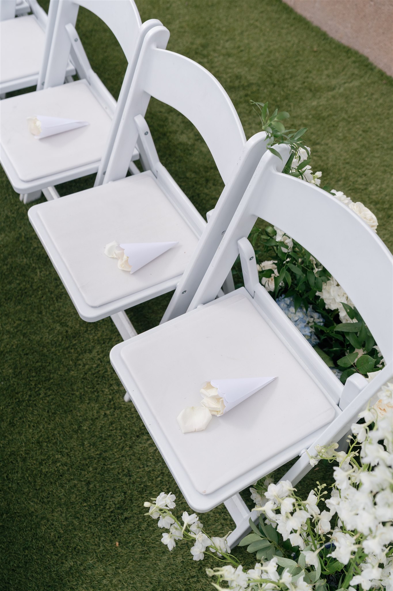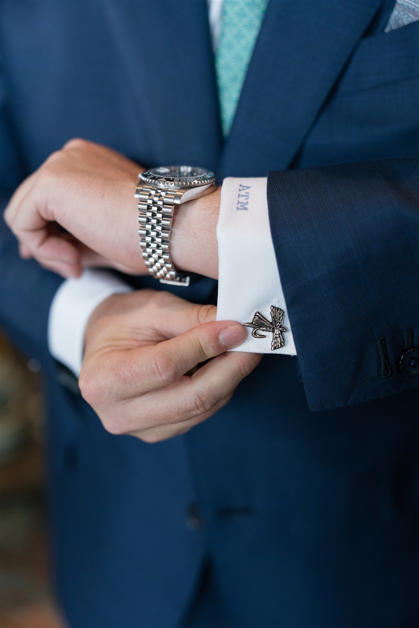 The design featured a classic palette of soft blues and crisp whites, elevated with a playful mix of chinoiserie pots and natural rattan textures. The balance of elegance and earthiness made the space feel both refined and welcoming, a true reflection of Autumn and Drew’s personalities. Every detail felt intentional, from the patterned napkins to the custom prints created by Montana Paper Company, weaving a story of sophistication with a touch of whimsy. Autumn and Drew’s story began with them fly fishing and Drew proposing in the river the runs behind The Westin. Throughout the design, there were subtle nods to this unique part of their story with pheasant feathers and fishing creels to give a personal nod to their story.