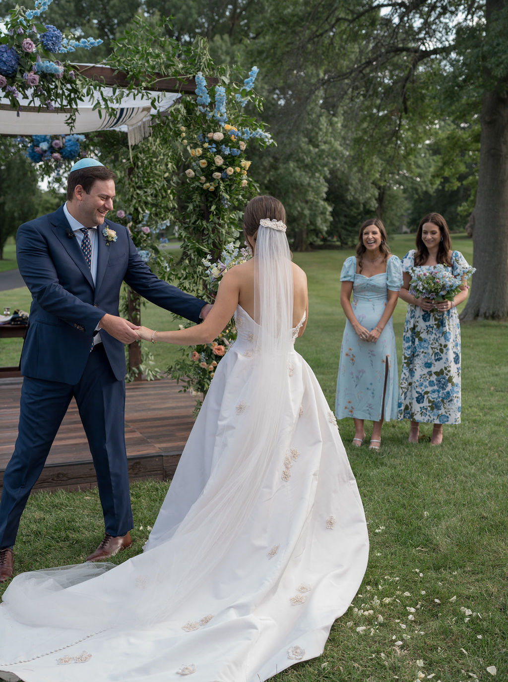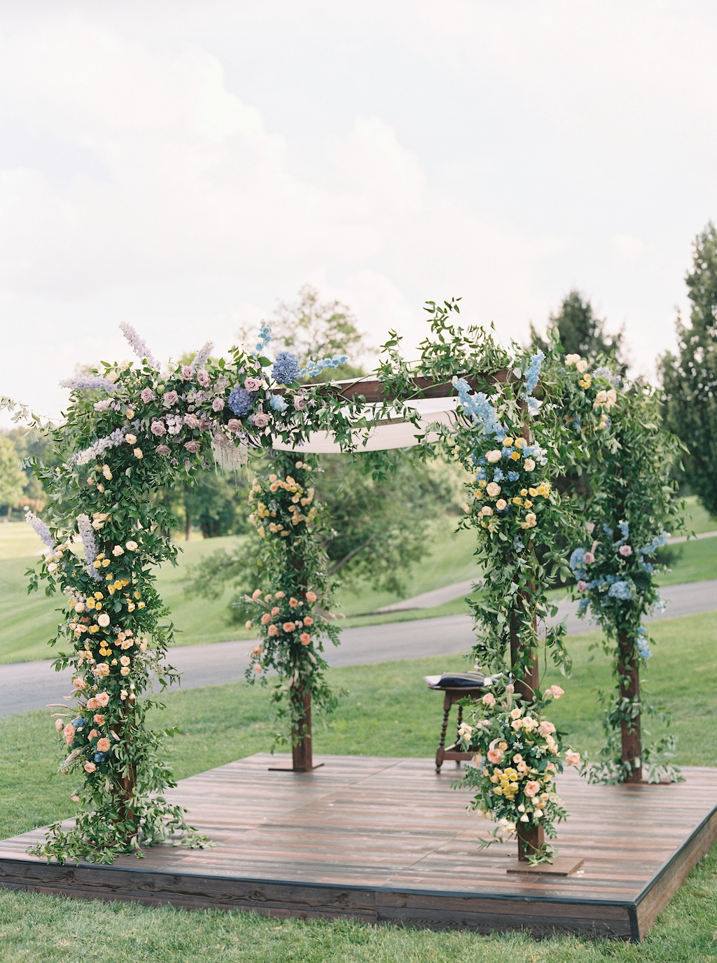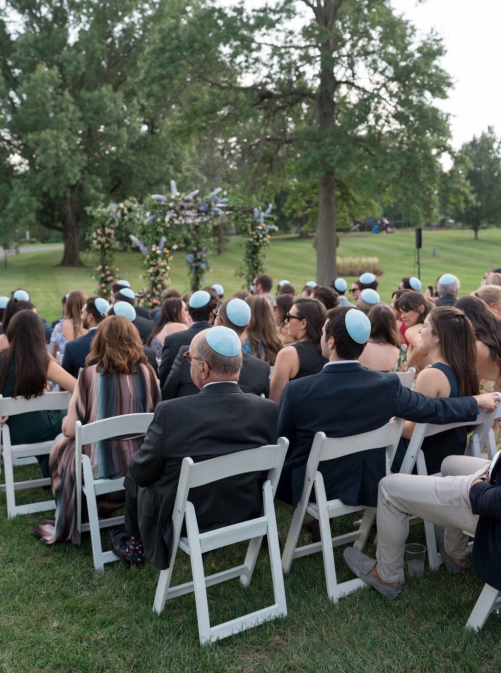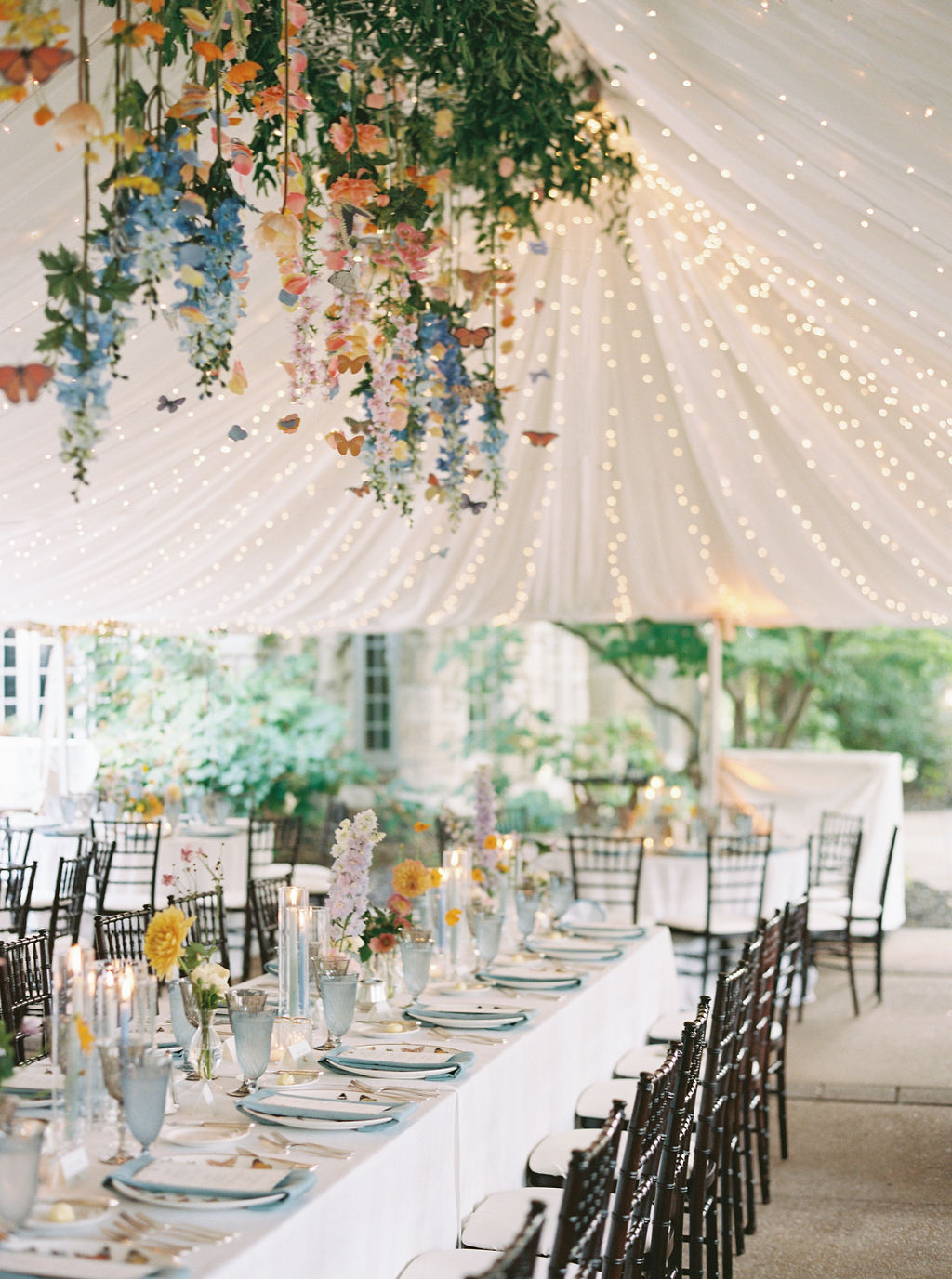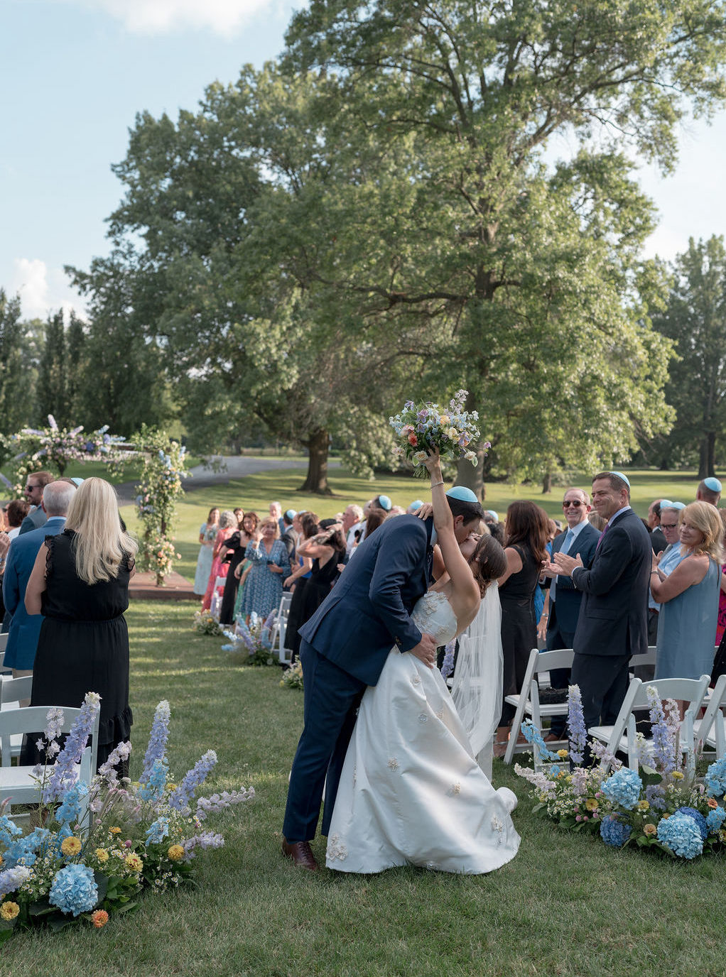 Leah chose Westwood Country Club in Clayton St. Louis, where she grew up, for their wedding and it was the perfect setting to have an outdoor ceremony and cocktail hour with a tented reception. Leah’s initial vision was centered around whimsical and colorful butterfly chargers combined with colorful florals for an overall English garden aesthetic. Their chuppah was adorned with gorgeous colorful flowers and both of Leah + Drew’s rabbis married them together, making the ceremony deeply personal and special. The overall aesthetic was a mix of color and eclectic decor with a touch of romance and whimsy. Leah’s vision was executed perfectly and it was a dream day in every way!