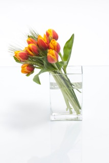 Place the tulips in the vase, one by one, with the stems all in the same diagonal direction.