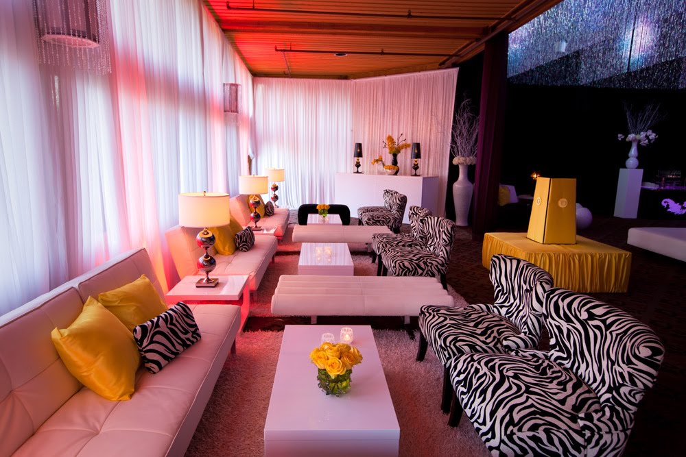 Design Works transformed the space with couches, love seats, coffee tables and chairs, along with draping and flowers to create a modern, chic lounge feel for the wedding reception.