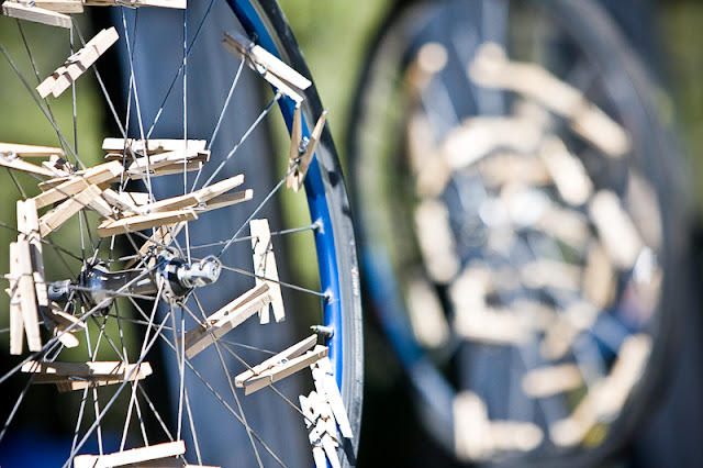 cloths pins attached seating cards to the spokes of a mountain bike tire