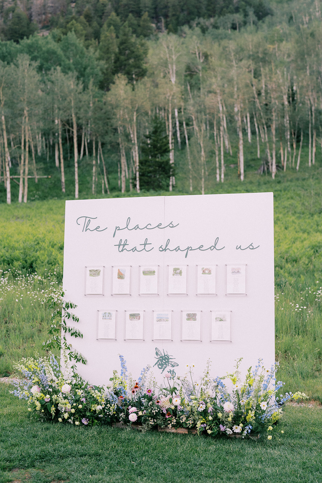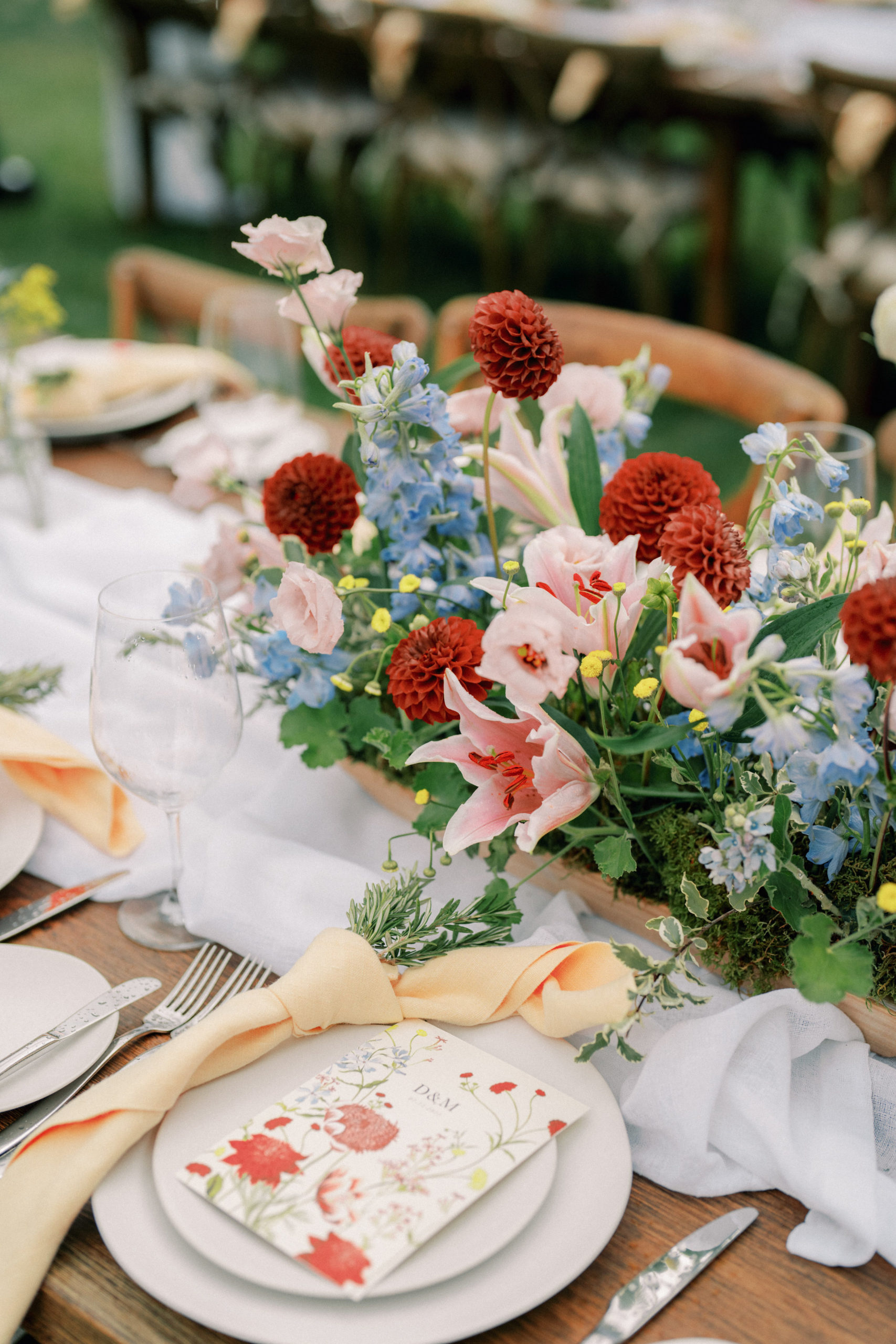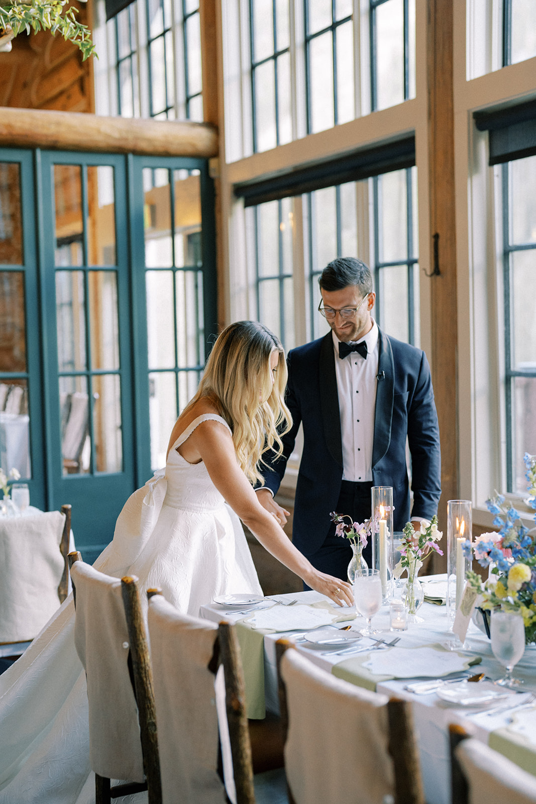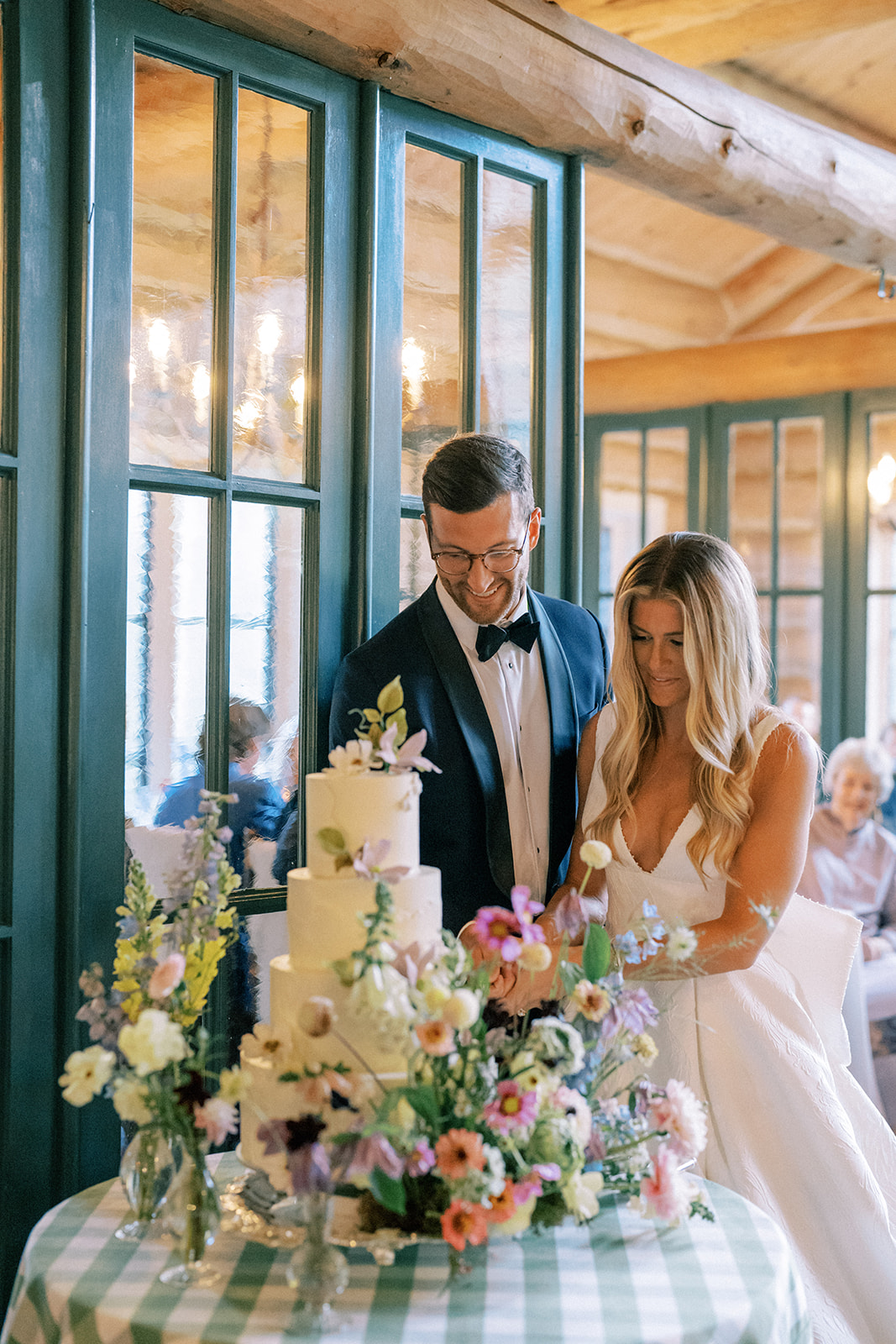 Before walking inside, guests found their seats on a completely custom escort board from Knapp Design Co. that had custom watercolor sketches of all the places that meant something to the couple. As guests found their seats, they were taken to a room that had been transformed with more wildflowers, a showstopping cake by Katy Pierson Cakes and a five-star meal by the amazing chefs at Beano’s Cabin. At their seats, one of our favorite moments was the charger that doubled as a placemat, a menu and a place card. It was a fun way to add a pop of color to the table in a practical way.