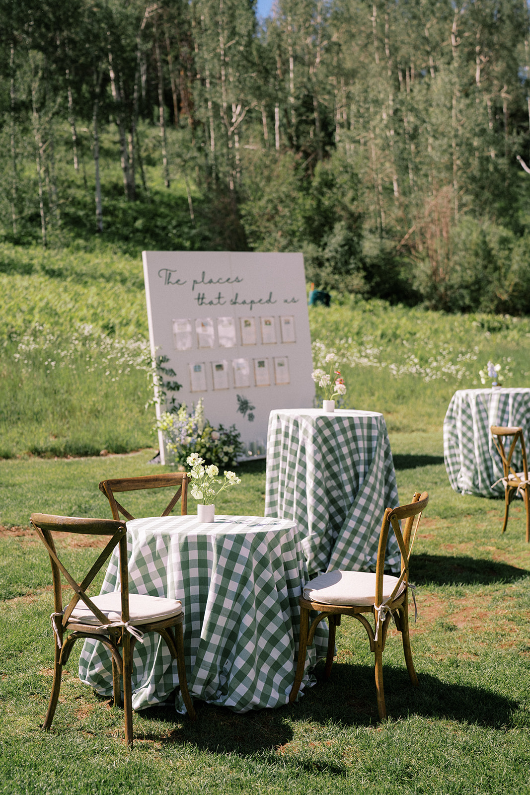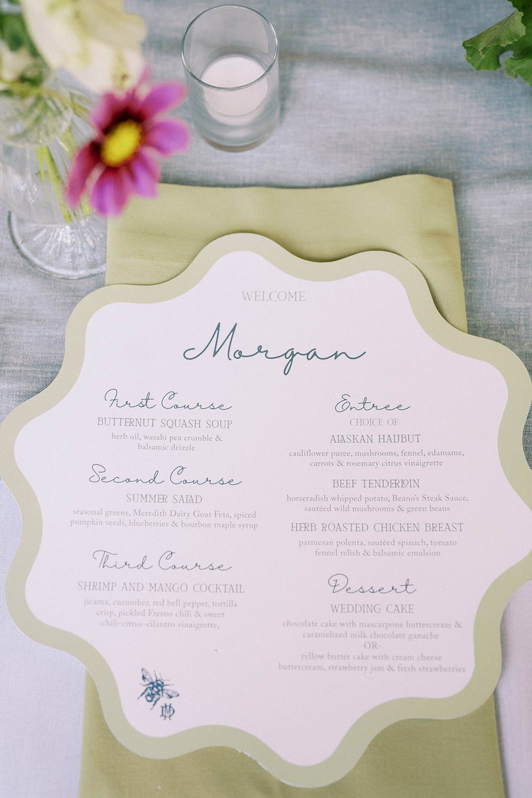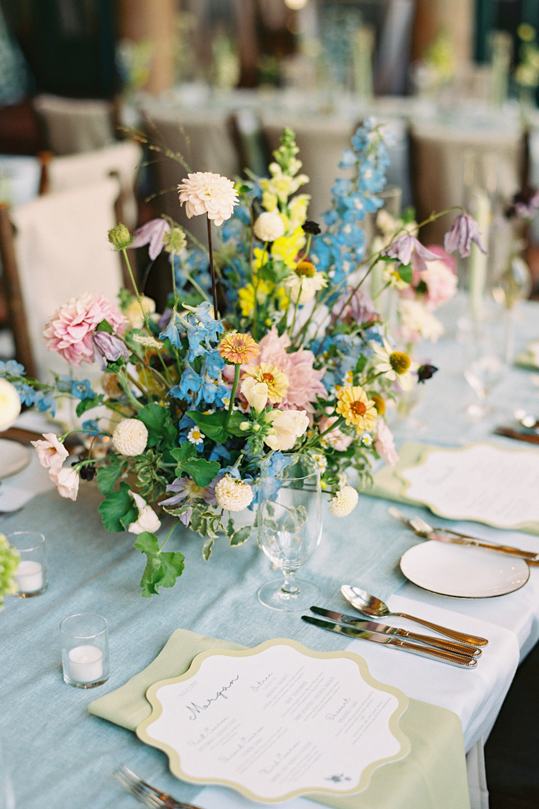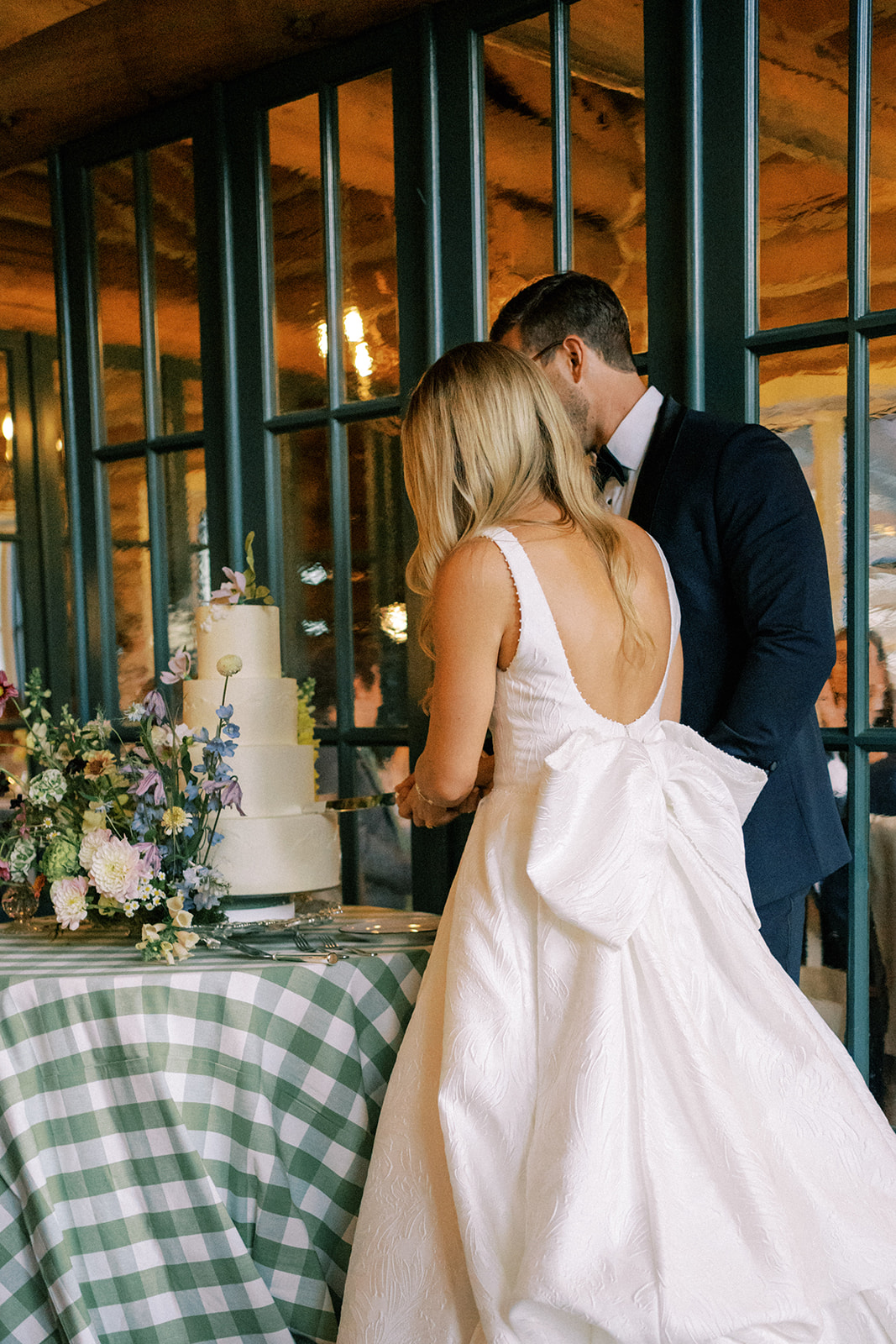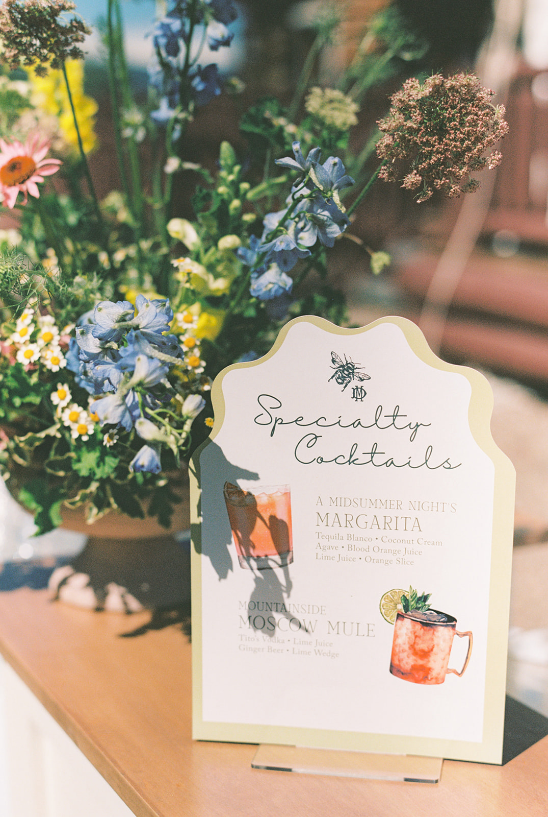 Before walking inside, guests found their seats on a completely custom escort board from Knapp Design Co. that had custom watercolor sketches of all the places that meant something to the couple. As guests found their seats, they were taken to a room that had been transformed with more wildflowers, a showstopping cake by Katy Pierson Cakes and a five-star meal by the amazing chefs at Beano’s Cabin. At their seats, one of our favorite moments was the charger that doubled as a placemat, a menu and a place card. It was a fun way to add a pop of color to the table in a practical way.