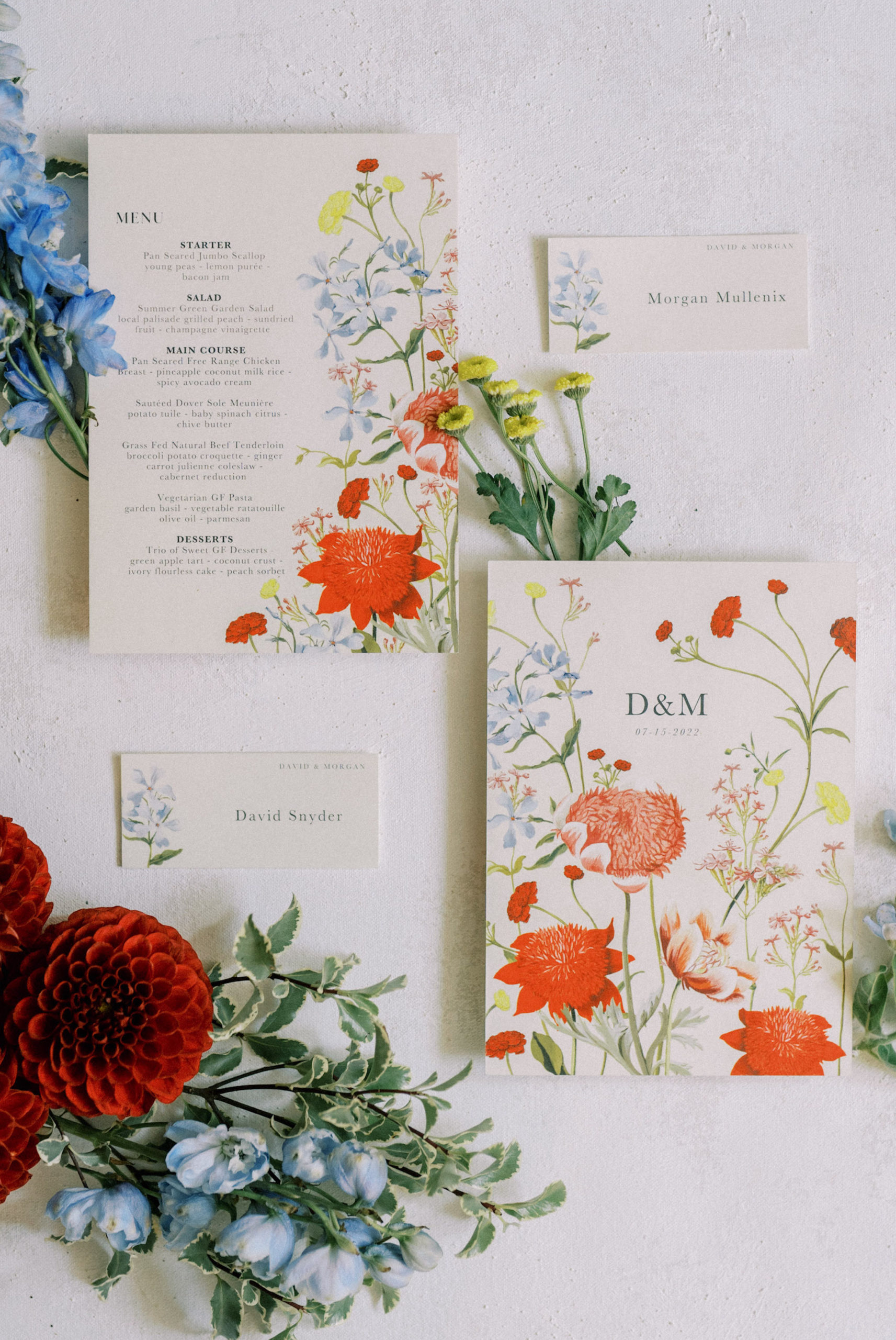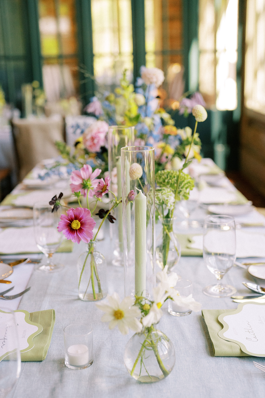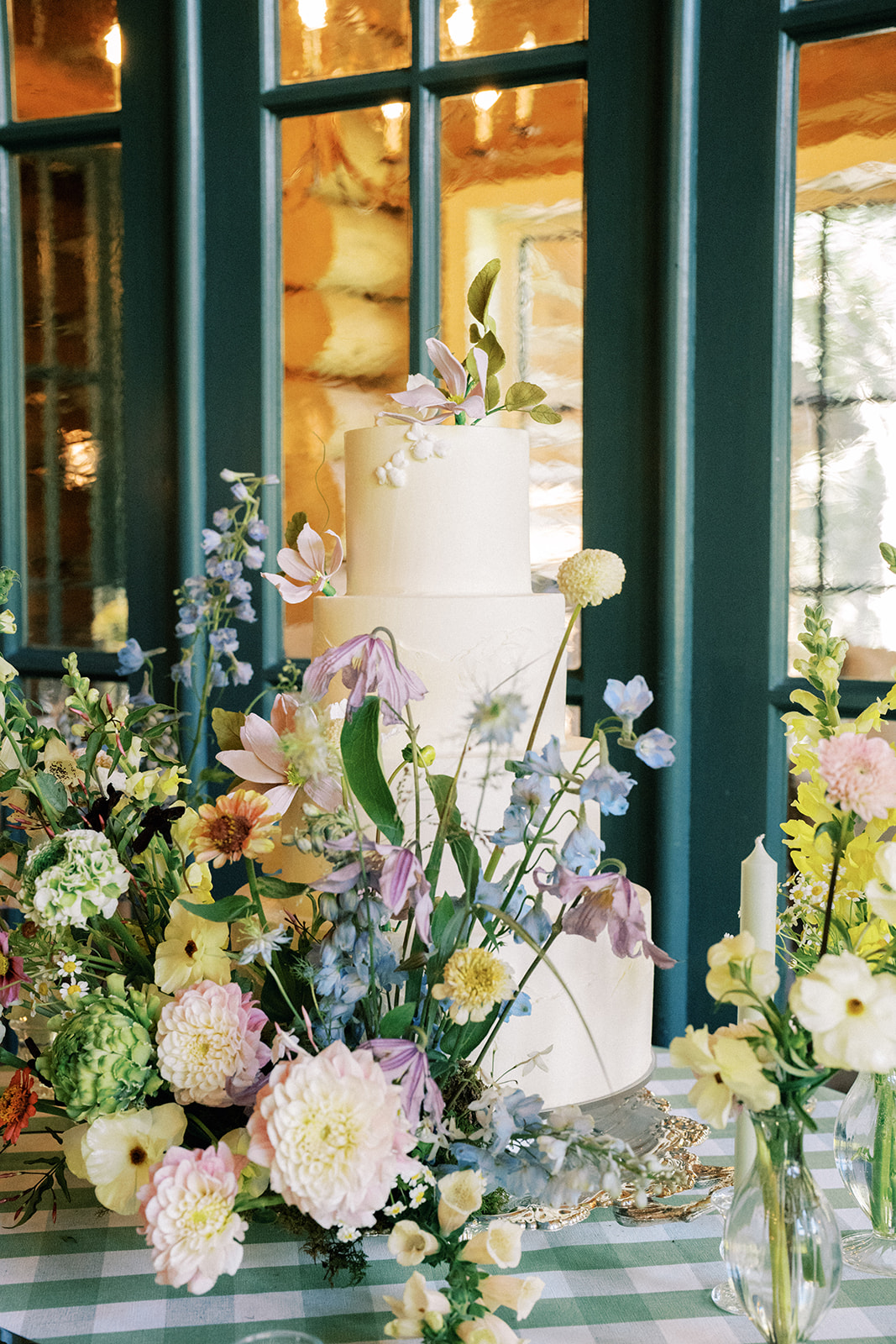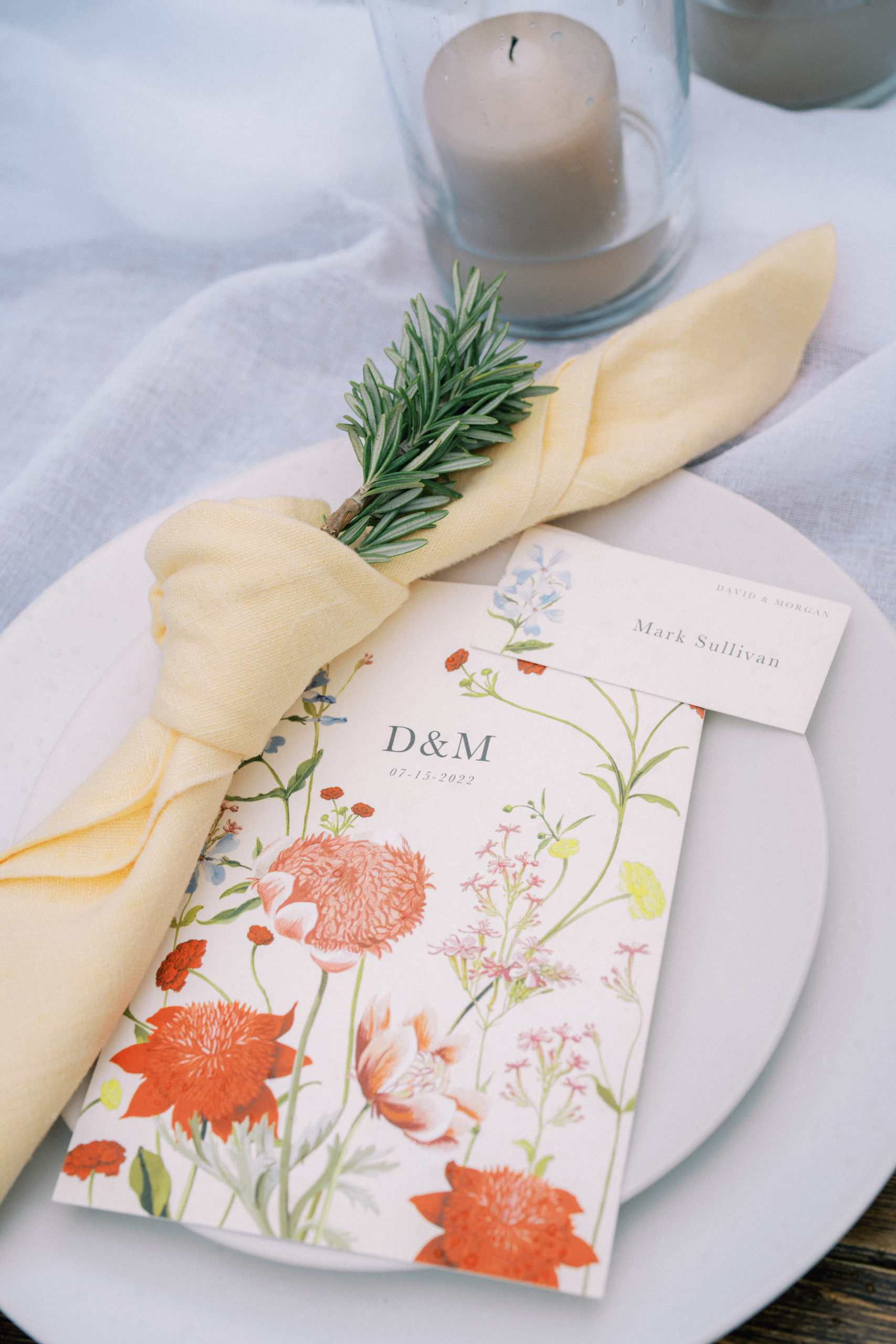 Before walking inside, guests found their seats on a completely custom escort board from Knapp Design Co. that had custom watercolor sketches of all the places that meant something to the couple. As guests found their seats, they were taken to a room that had been transformed with more wildflowers, a showstopping cake by Katy Pierson Cakes and a five-star meal by the amazing chefs at Beano’s Cabin. At their seats, one of our favorite moments was the charger that doubled as a placemat, a menu and a place card. It was a fun way to add a pop of color to the table in a practical way.