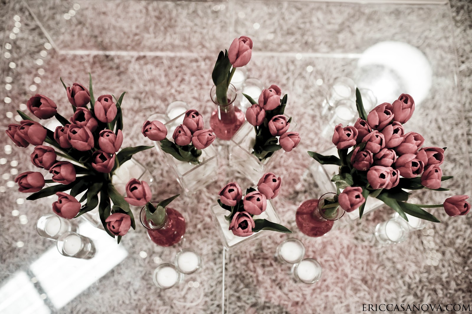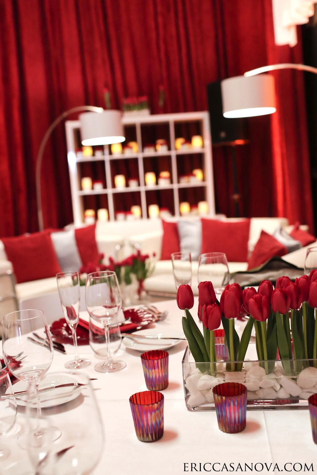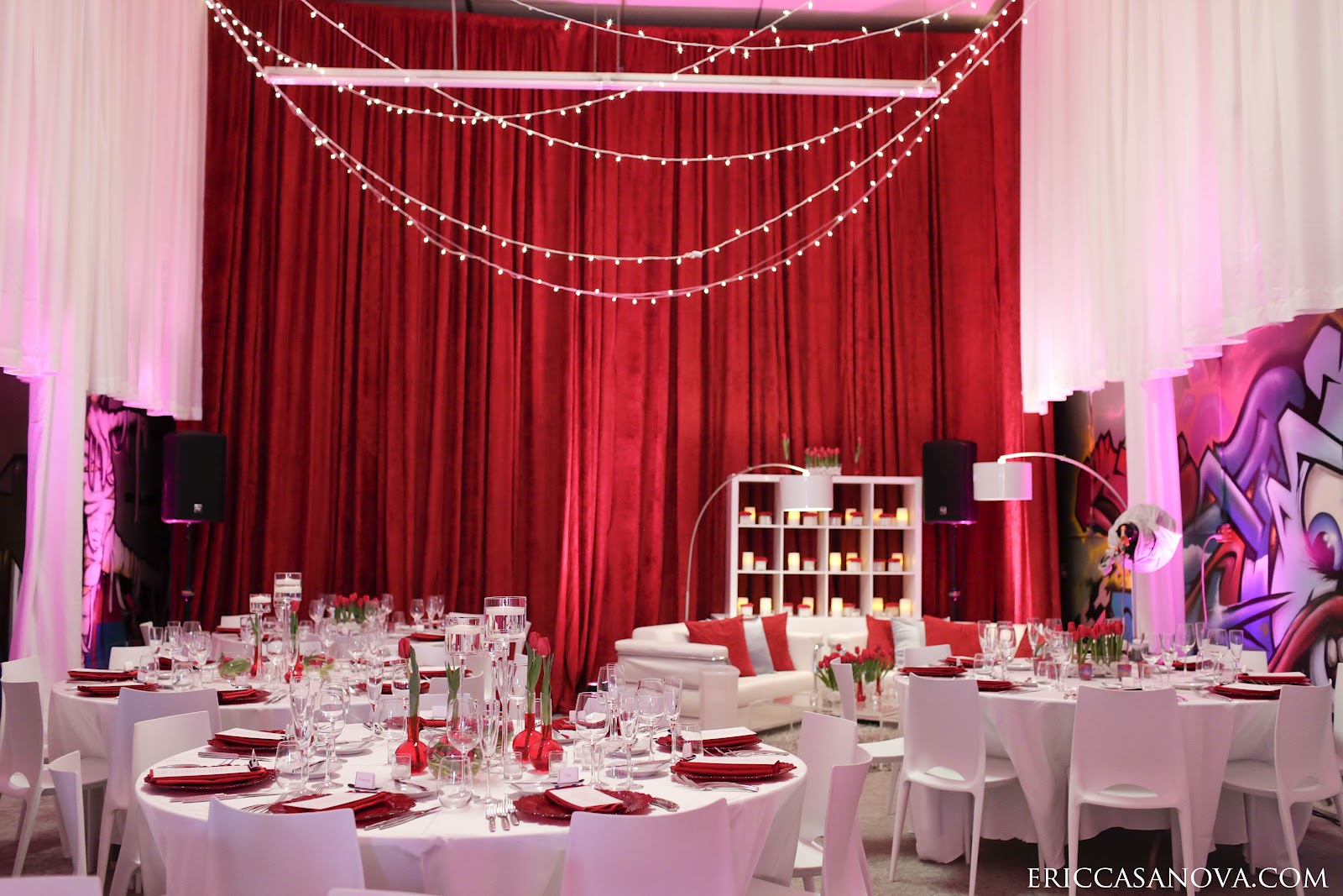 We centered the inspiration on Nuni’s favorite flower, red tulips. She wanted a simple design of red and white for the flowers and decor. Floor to ceiling drape covered the walls but let the graffiti peak through to keep the skate warehouse vibe for the party.