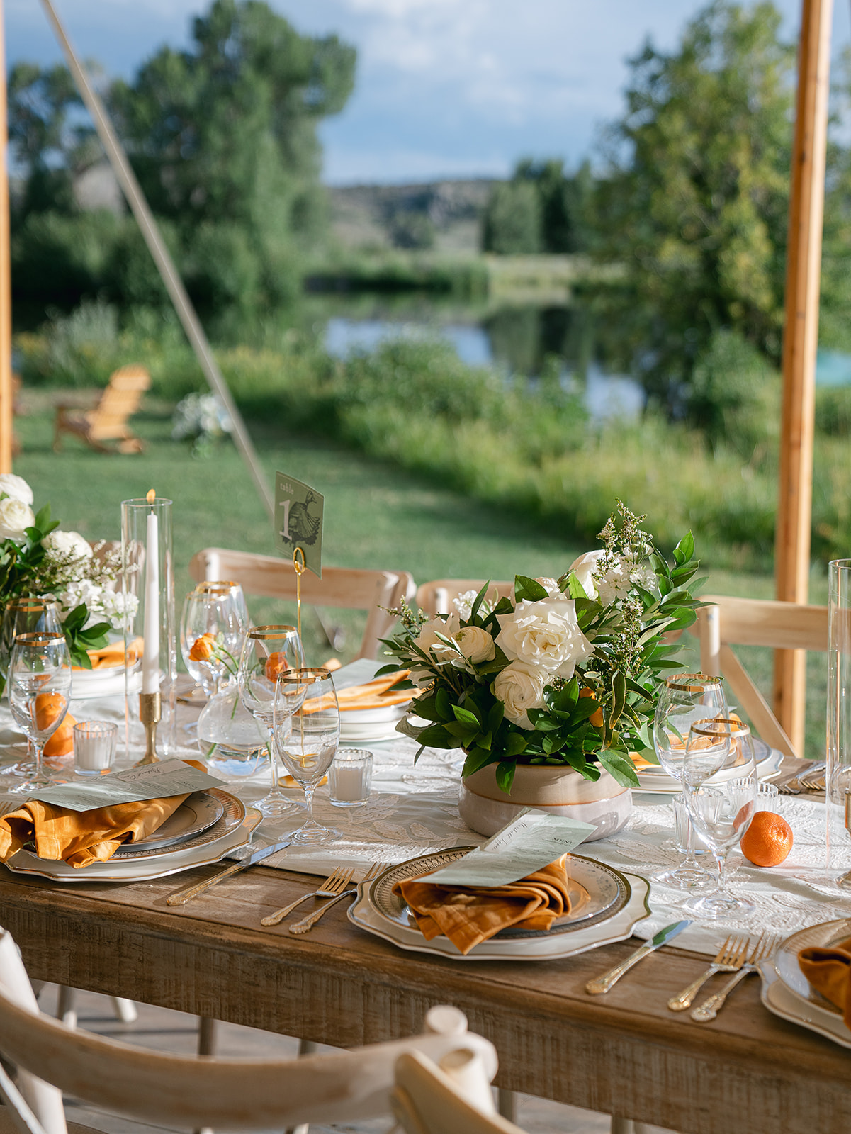 Embracing and drawing on the quintessential sunny season, guests were treated to tent full of bright pops of orange and blue, embellished by natural textures, pops of citrus and a canopy of lanterns covering the dance floor. With libations in hand & bellies full of a delicious dinner, the room was treated to another round of heartwarming toasts – including the groom’s tender and eloquent tribute to his bride, his family and special time in Wyoming. Teary eyes were dried just in time to hit the dance floor powered by the iconic Elan Artists – with a party goers dancing until the wee hours of the morning.