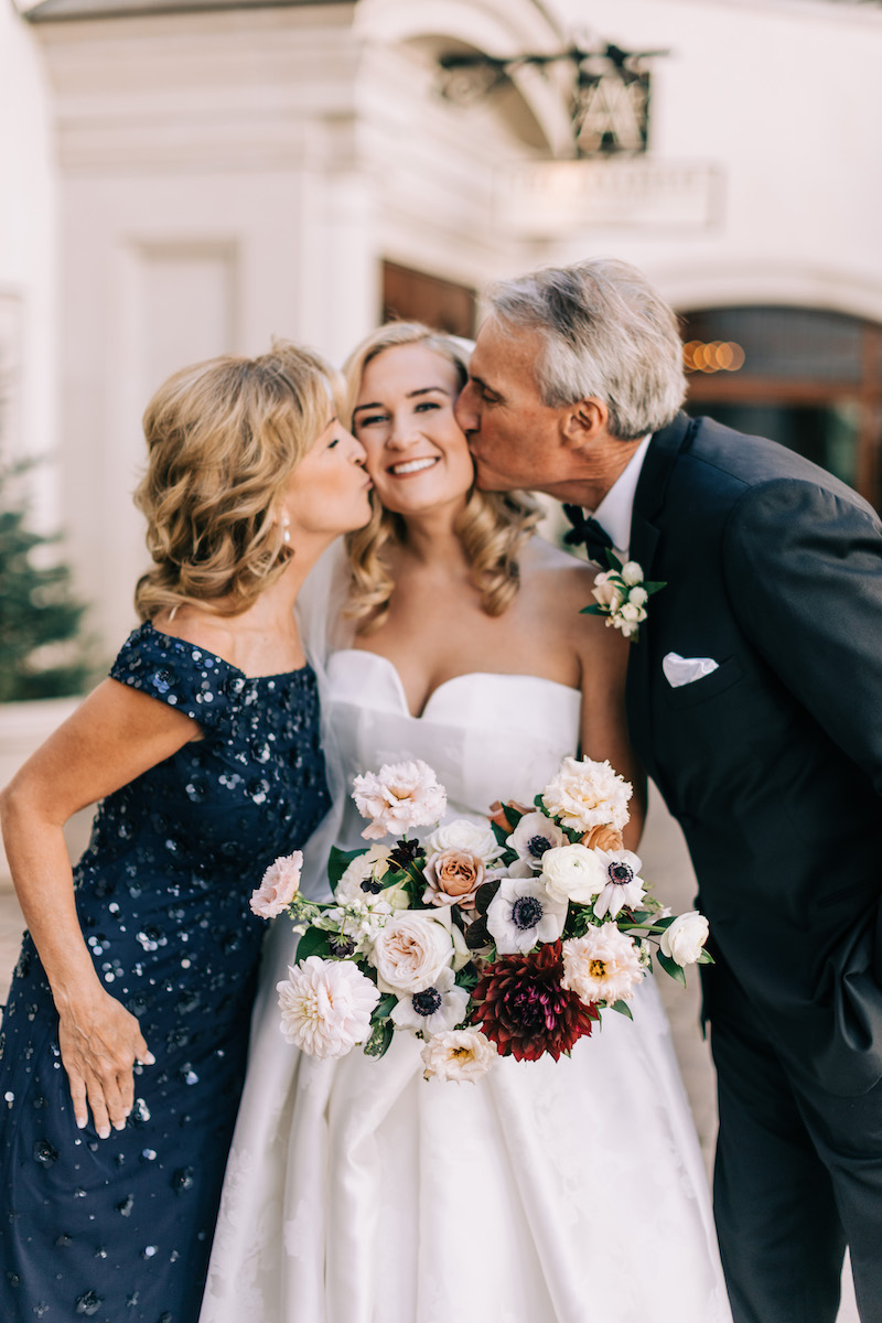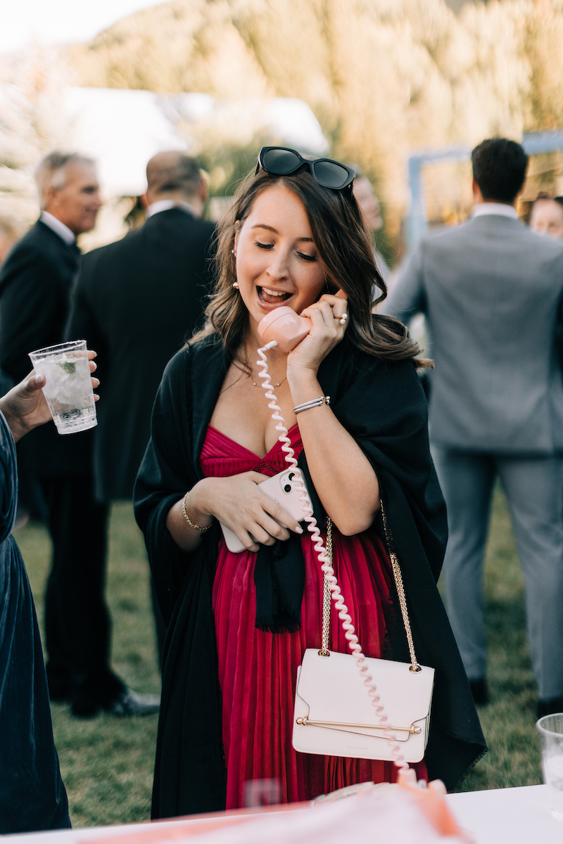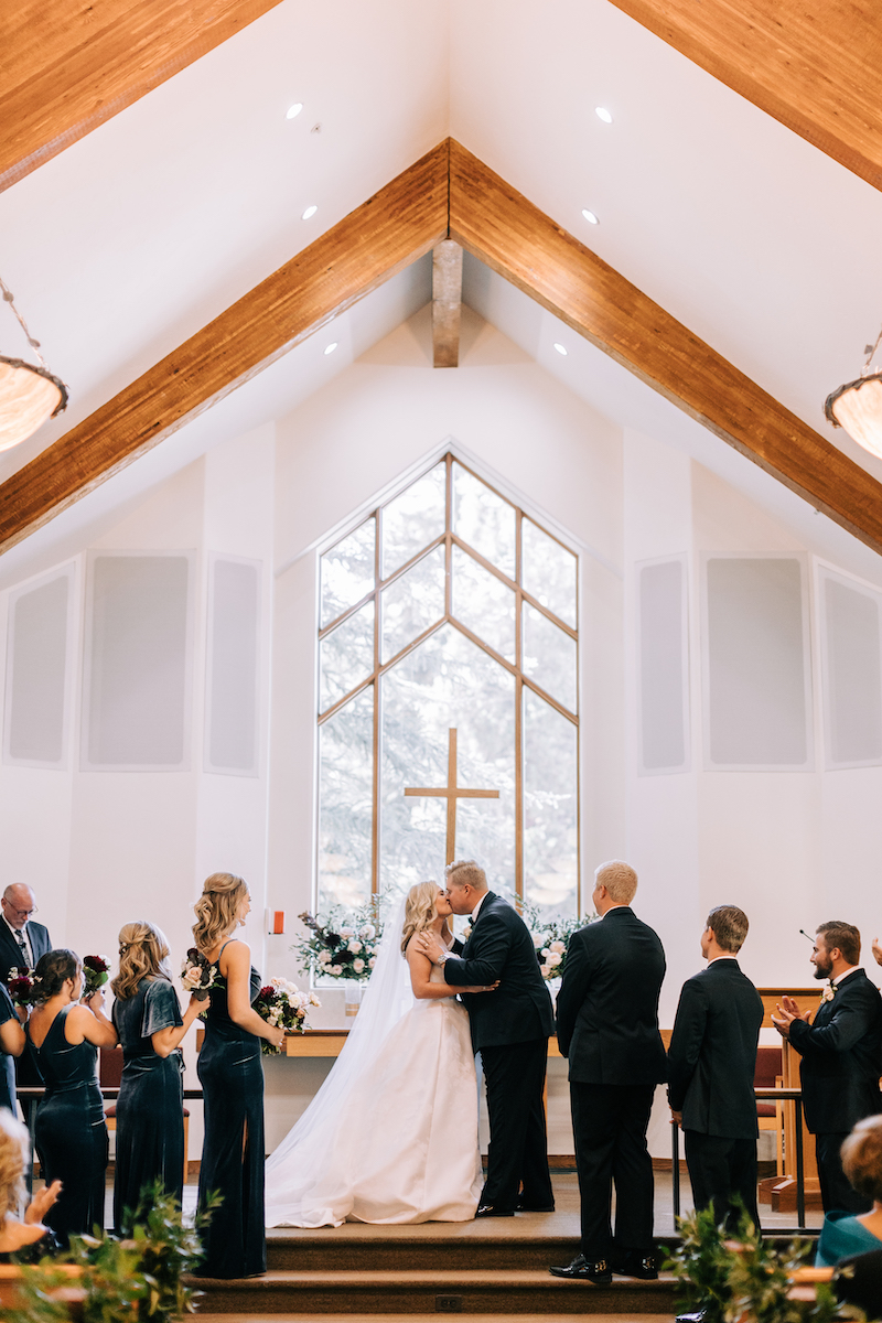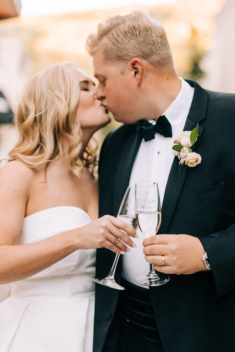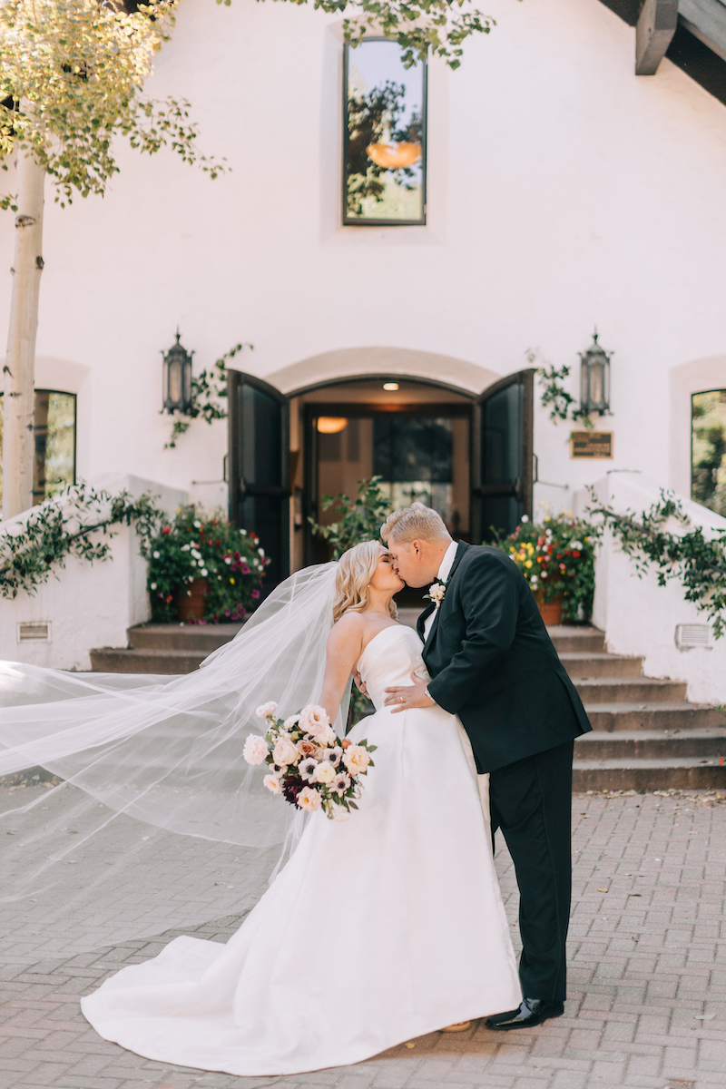 Marie + Peyton came to us with a vision of a classic Colorado soirée for their out-of-state families and friends to enjoy, with timeless details and pops of trend throughout. They opted for classic Fall colors of navy blue and deep burgundy and entrusted Figment Floral to bring their floral dreams to life. After a traditional and thoughtful ceremony at The Vail Chapel, guests made their way to the base of the mountain for cocktail hour, where they enjoyed live music from Oncue Entertainment and left cheeky messages on the pink After The Tone audio guest book. They picked up their custom champagne flutes as a welcome sip and made their way to the beautiful tent in the heart of the square. The rest of the evening was an EPIC dance party thanks to Soul X, and the party didn’t stop there! Guests made their way to Shakedown Saloon to dance the night away.