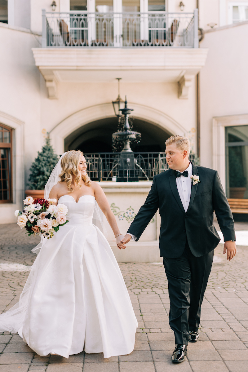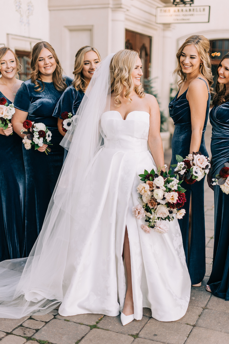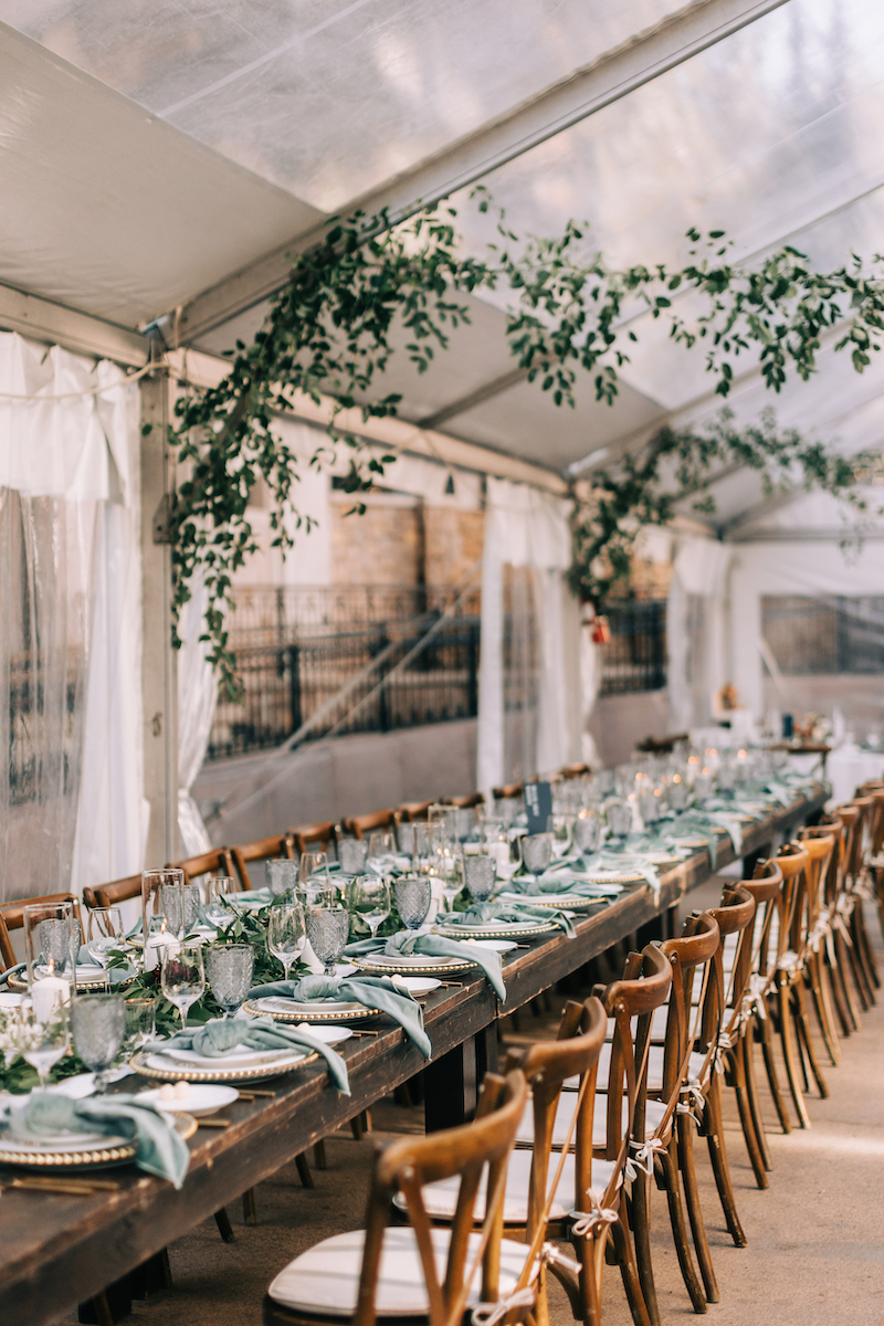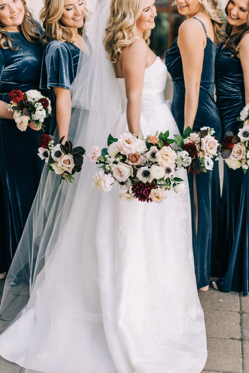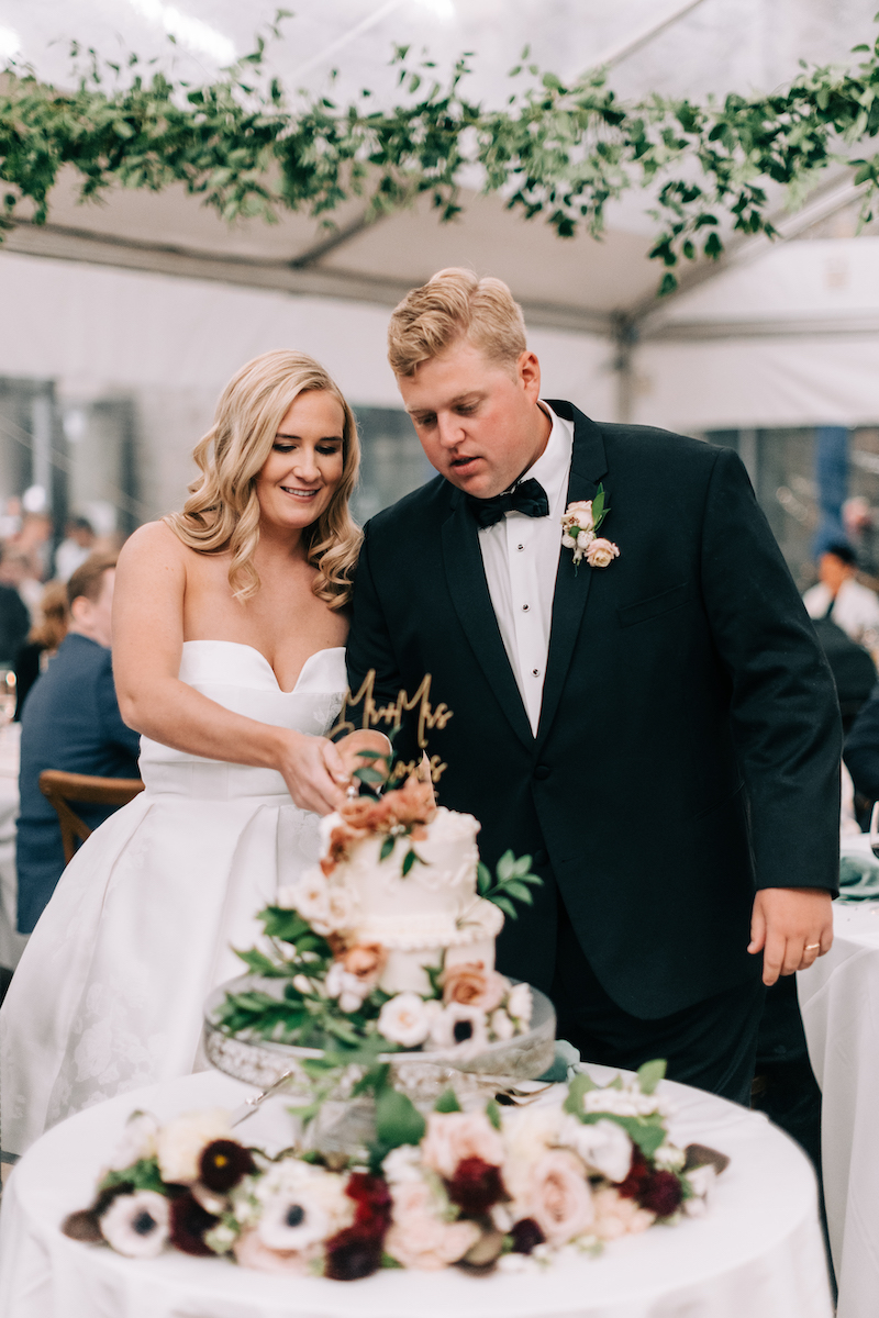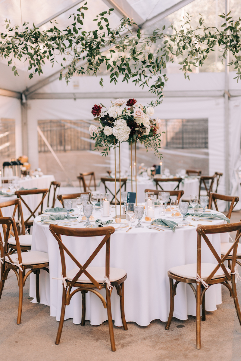 Marie + Peyton came to us with a vision of a classic Colorado soirée for their out-of-state families and friends to enjoy, with timeless details and pops of trend throughout. They opted for classic Fall colors of navy blue and deep burgundy and entrusted Figment Floral to bring their floral dreams to life. After a traditional and thoughtful ceremony at The Vail Chapel, guests made their way to the base of the mountain for cocktail hour, where they enjoyed live music from Oncue Entertainment and left cheeky messages on the pink After The Tone audio guest book. They picked up their custom champagne flutes as a welcome sip and made their way to the beautiful tent in the heart of the square. The rest of the evening was an EPIC dance party thanks to Soul X, and the party didn’t stop there! Guests made their way to Shakedown Saloon to dance the night away.