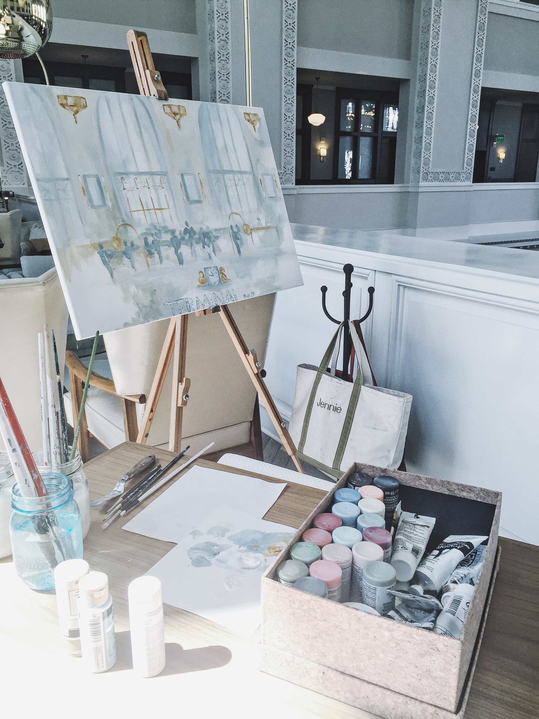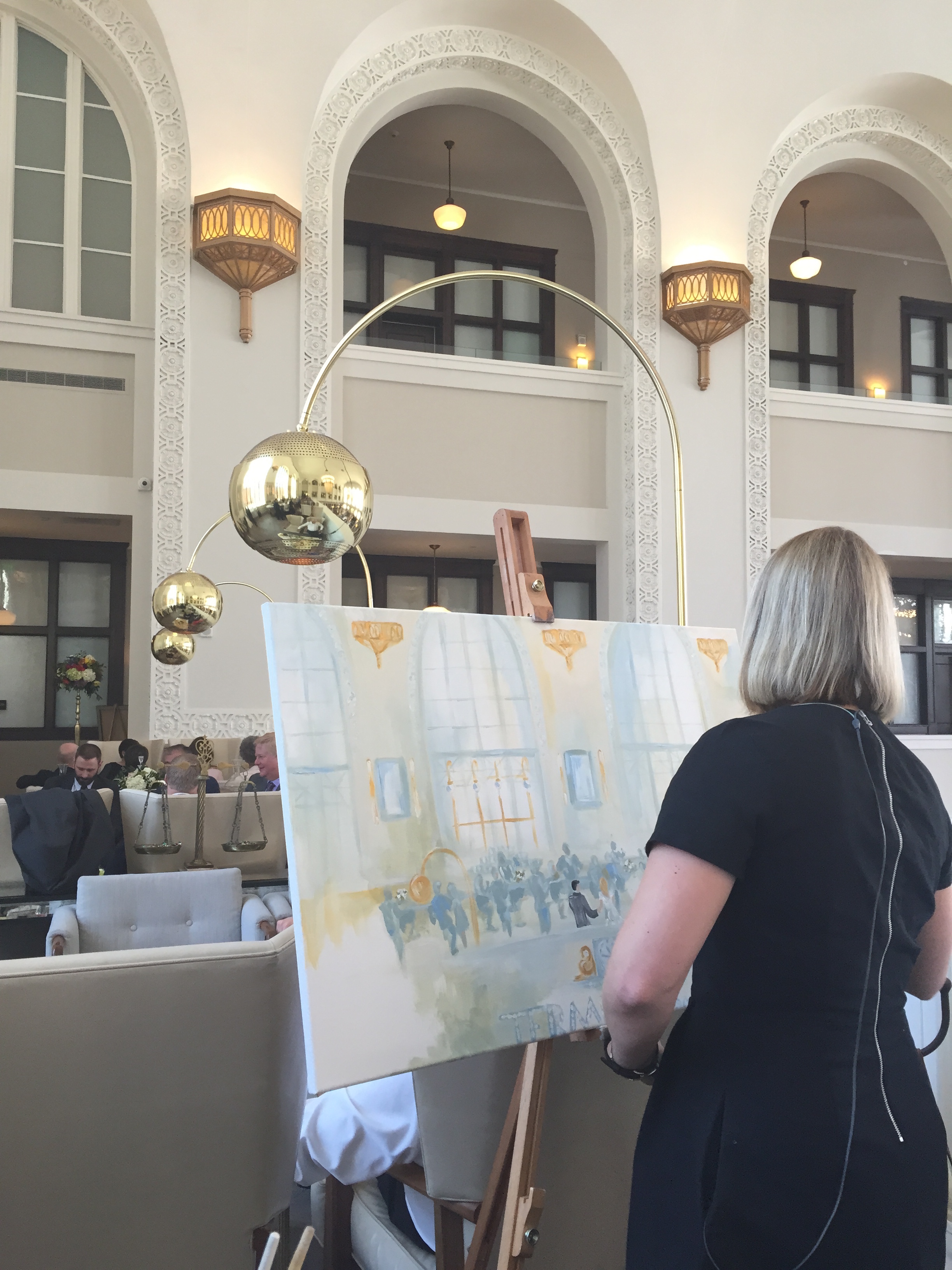 Afterwards, guests headed into the Cooper Lounge to enjoy cocktails and cake from Kim & Jakes Cakes. Jennie from Jennie Lou Art captured the reception by painting.