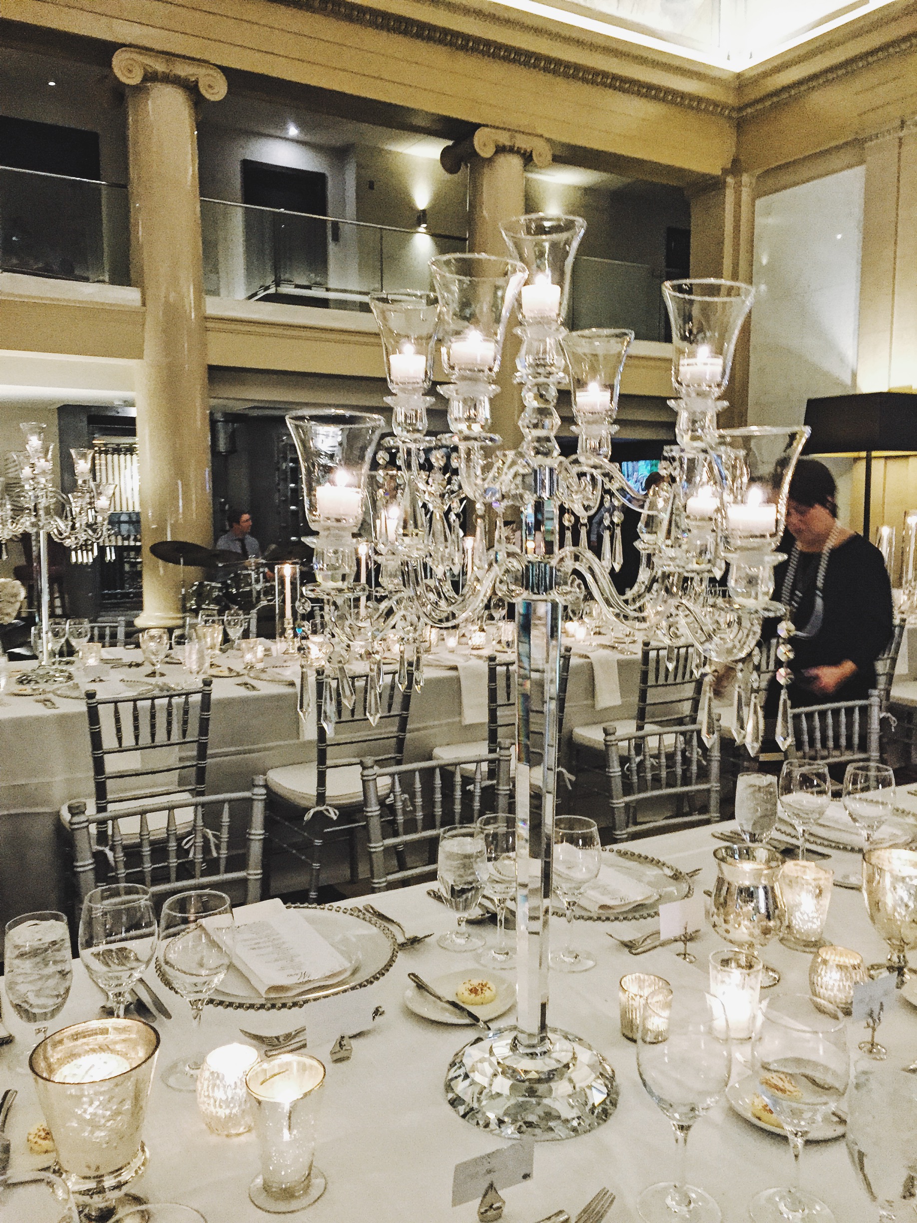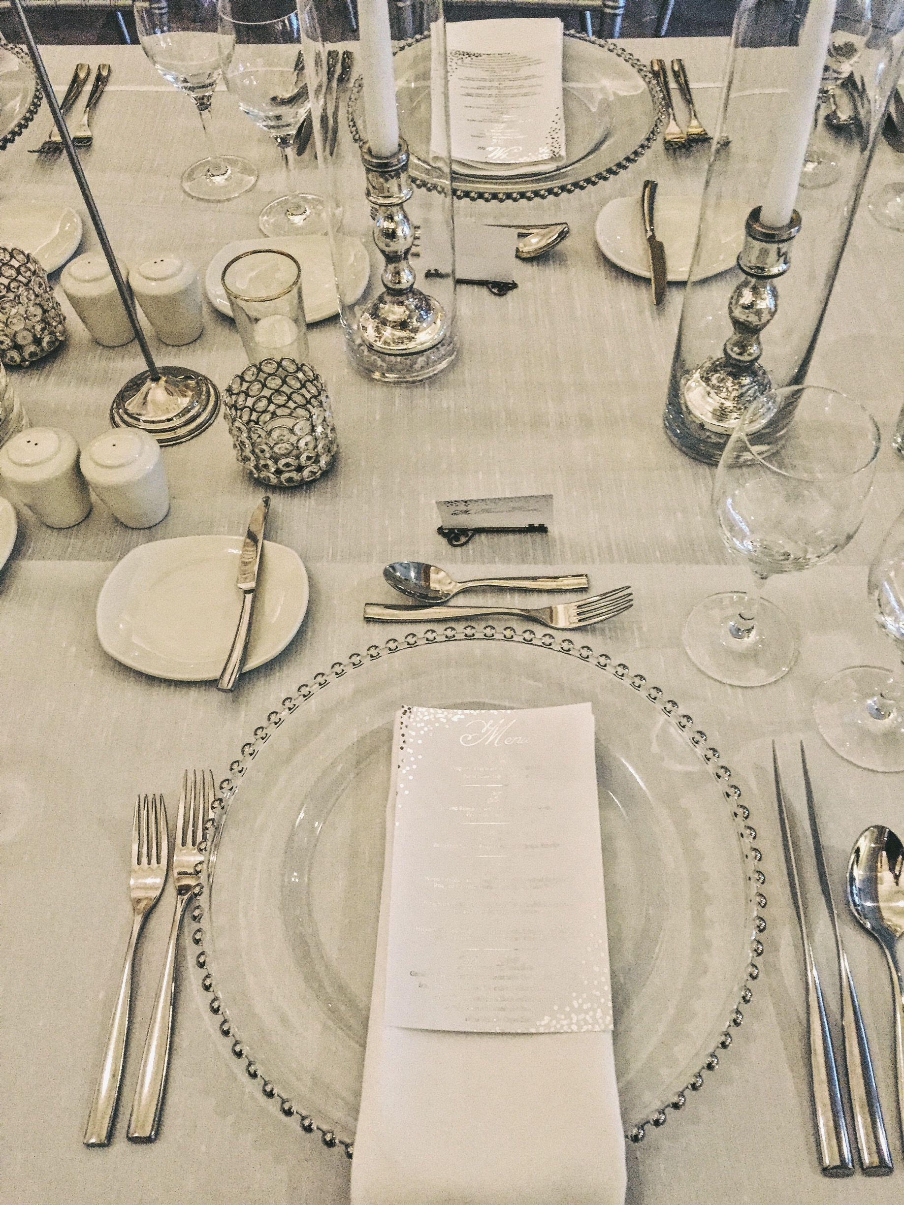 The rehearsal dinner was held at the Denver Renaissance Hotel in downtown Denver. DesignWorks transformed the hotel lobby space into an incredible dinner space for 75 guests. Long rows of tables were adorned with white linens, crystal candelabras, and hundreds of metallic votives. Each table was named after places the couple had been to. Every place setting held a different place card holder that reflected the theme of the table. The New York table housed beautiful silver apples that held each guest’s name. Our bride left no detail unnoticed and it was a truly magical setup.