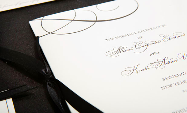 4. Most memorable project: Hmm. Tough choice. I would have to say Sydney and Chad (silk bound book cover with ribbon belly band woven through to hold the enclosures). It was unlike anything that I’ve ever done and I loved the challenge. Sydney also had a great appreciation for the materials we used so I was able to work with some of the finest paper, ribbon and book cloth available. 5. I love it when a bride and groom are...creative and unique. Since I design custom invitations, I like when clients come up with something new and different as opposed to picking an invitation from my portfolio and modifying it to fit their needs.