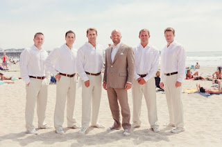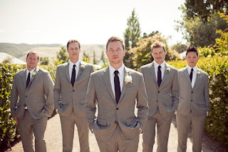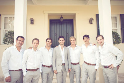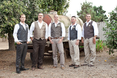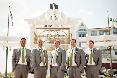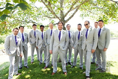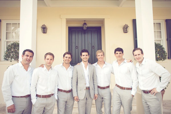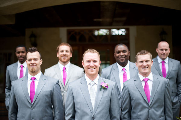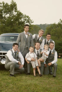 Although the Groom and groomsmen’s style of suit or tuxedo should be somewhat uniform there are many ways for the groom to stand out from the crowd. He could choose to wear a bow-tie while the groomsmen wore neckties. His tie or pocket scarf could be a different color than the groomsmen’s. He could wear a vest while the groomsmen do not. Here are a few examples of the groom standing out while still looking uniform with his men: