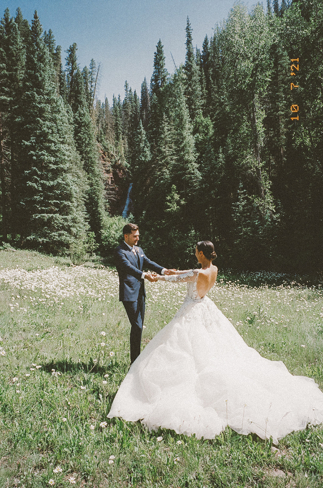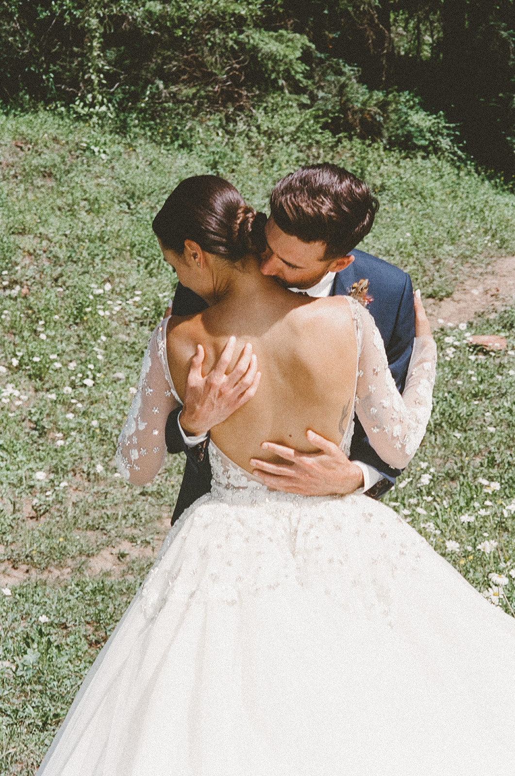 Their first look was absolutely breathtaking! Holly floated across the flower fields to surprise Matt in her gorgeous Galia Lahav gown with a tumbling waterfall and luscious trees in the distance. When he turned ‘the world just melted away and it felt like it was just the two of us surrounded by the beauty of the mountains in a field of wild daisies. It was the most perfect moment in time!’