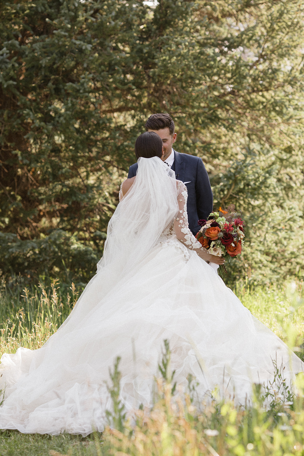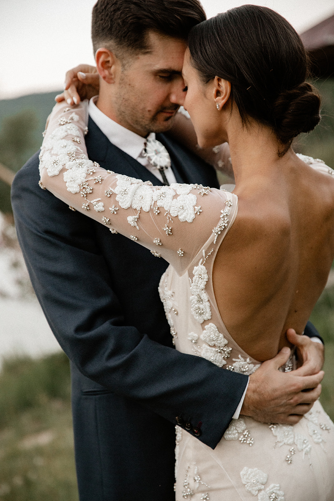 The bride and groom made their way to ceremony where layered woven rugs splashed down the aisle with guests seated at a mix of modern leather, mango wood, and fur chairs overlooking the gorgeous alpines of the Colorado Rockies. Holly’s sweet mom gifted her grandmother’s embroidered handkerchief that she pinned onto her bridal bouquet that she held as they walked down the aisle together. ‘The most serendipitous part about it all was that I also gave my mom a custom embroidered handkerchief as a wedding gift!’ Our hearts just melted as Holly + Matt read their vows to each other and said I do to their forever!