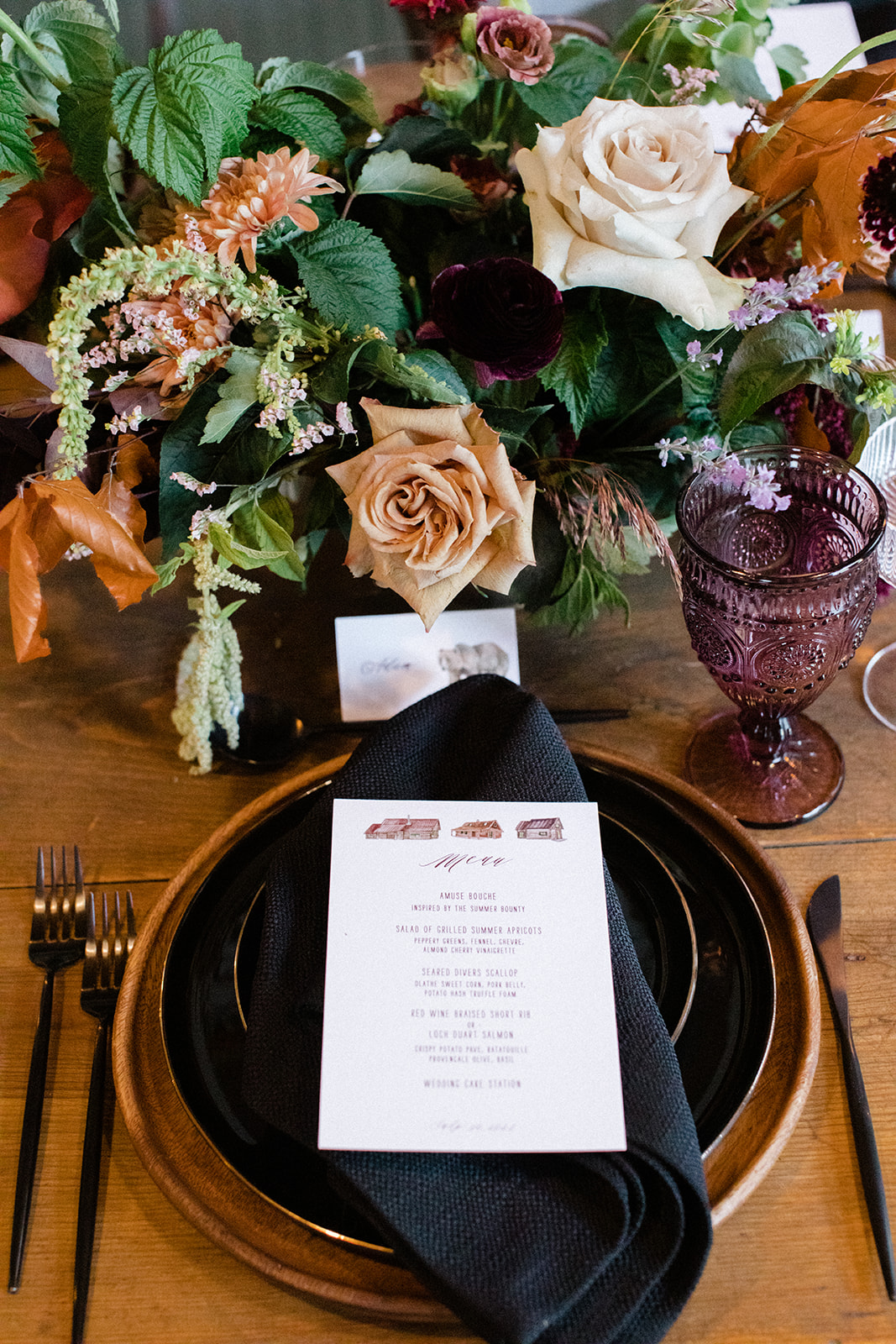 The guests then made their way to cocktail hour and reception, where they delighted in the newlywed’s signature cocktail ‘The Spicy Sprollie’ named after their pup, enjoyed a delicious meal, and danced the night away underneath the stars! Guests found their seats at warm wood tables dressed with gorgeous florals, acacia wood chargers, moody dinnerware, vintage burgundy glassware, and ribbed champagne coupes to toast with each place setting adorned with watercolor place cards with a bear, moose, deer, or fox as a nod to their love of animals. It truly was a day to remember as Holly + Matt celebrated their love with their nearest and dearest in such good cheer!