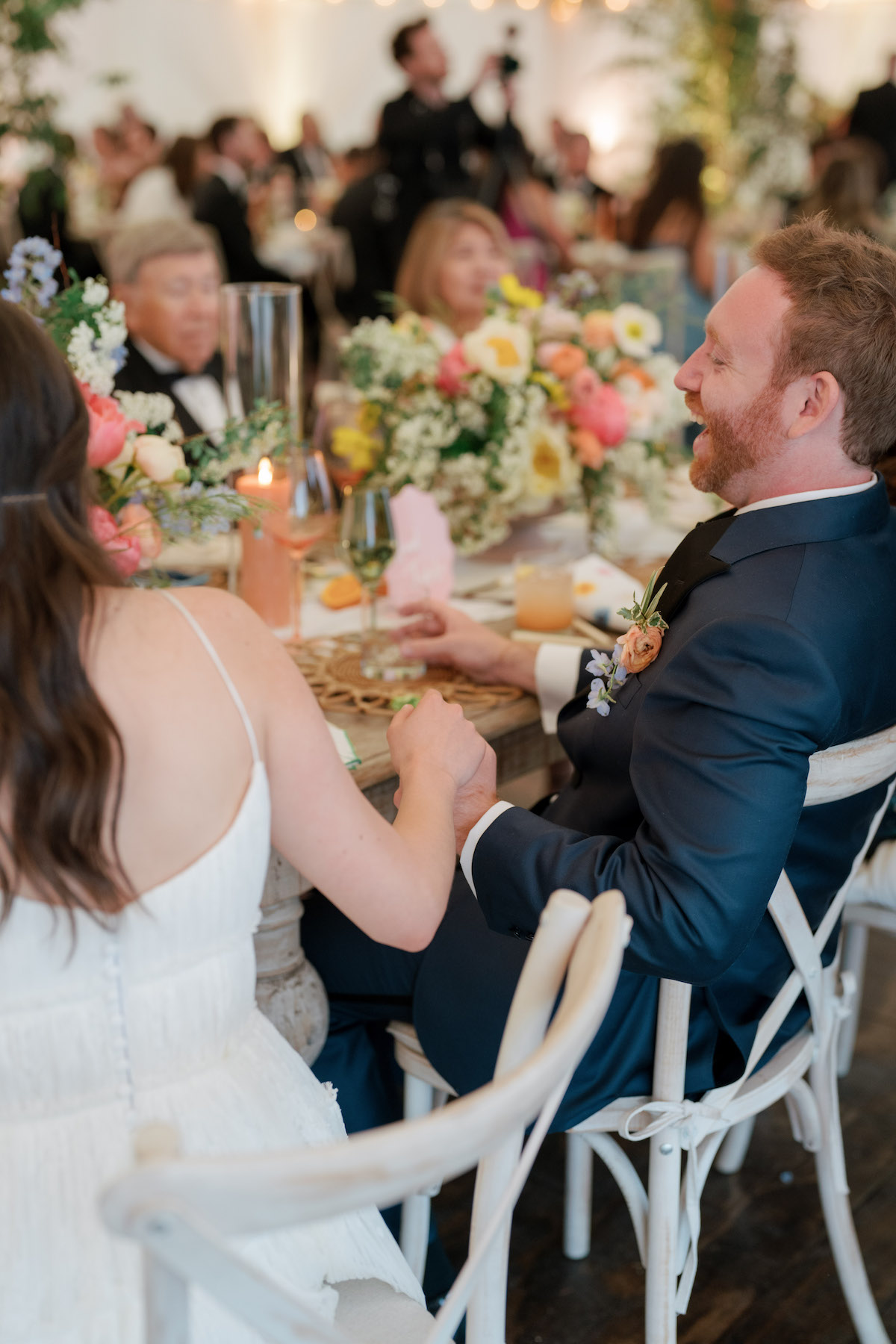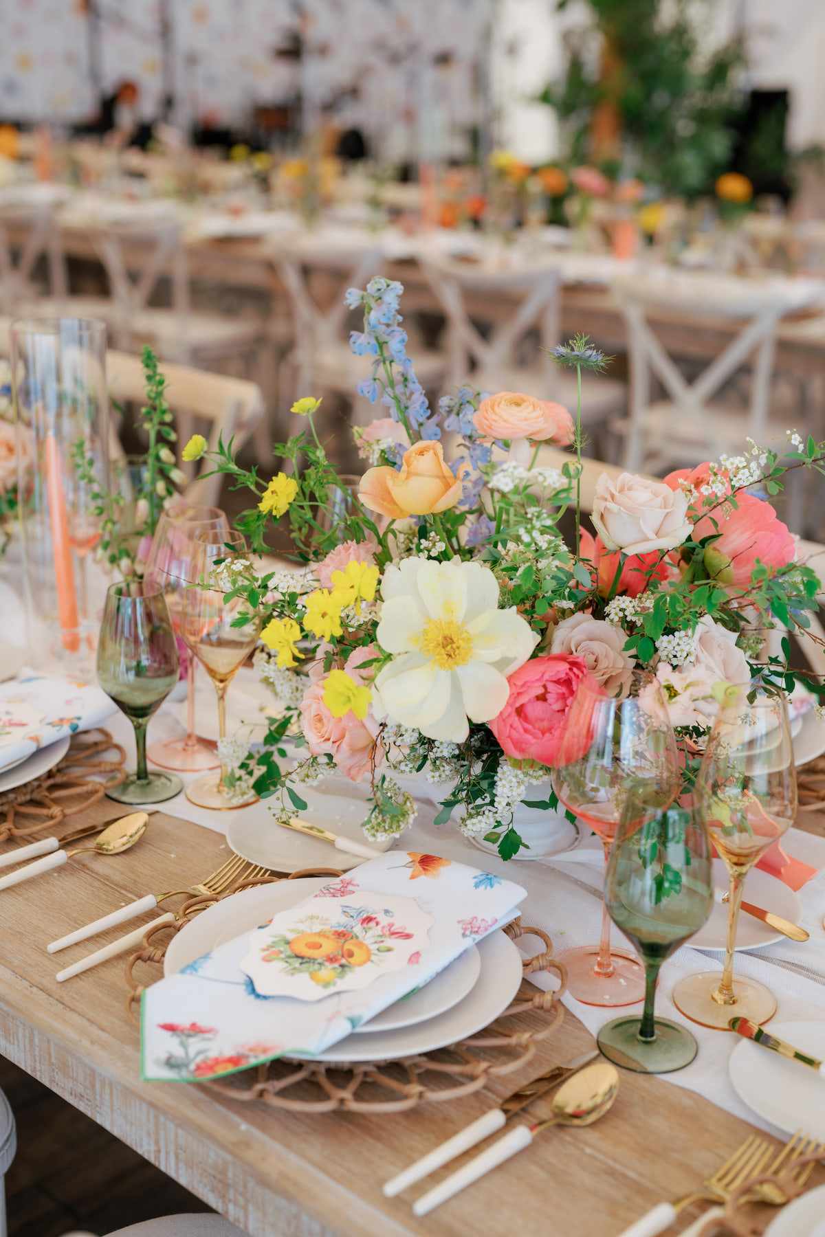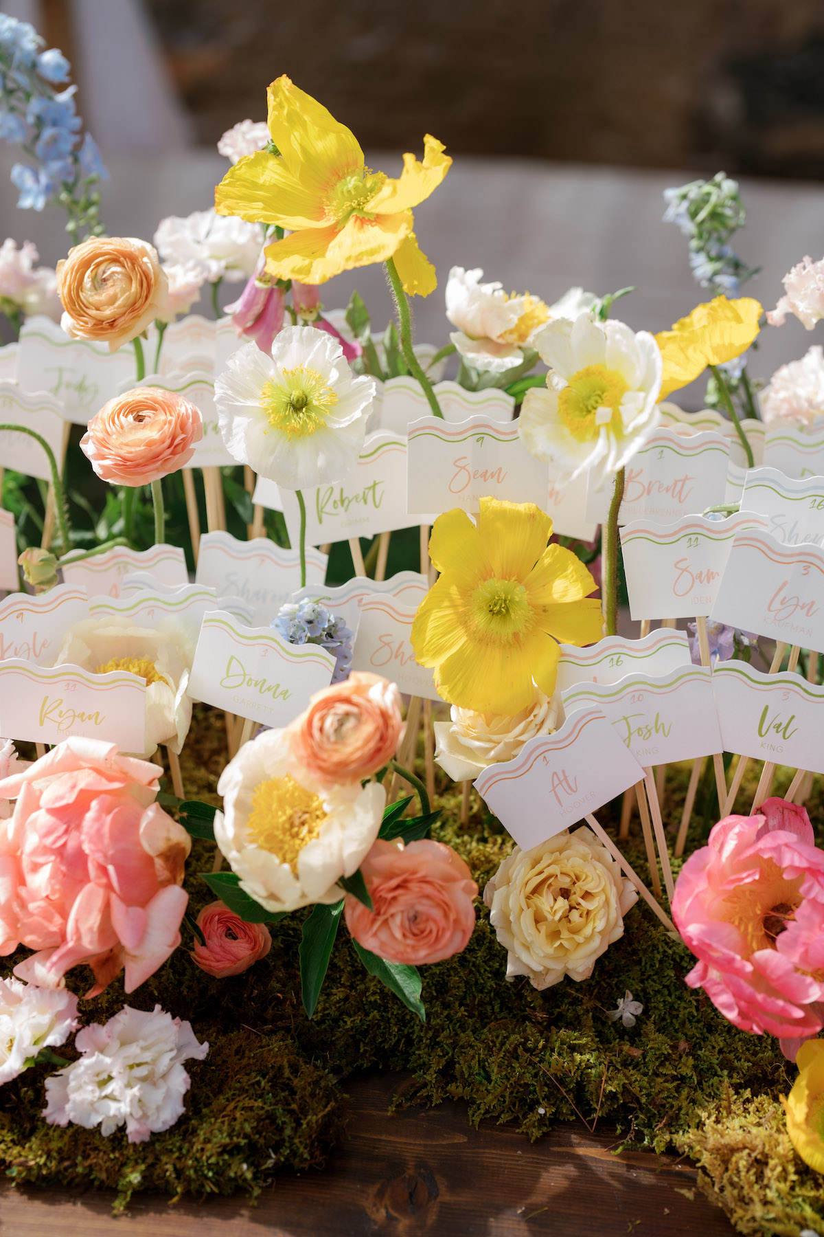 After the joyous ceremony, guests enjoyed cocktail hour and found their seats in the reception by way of a growing garden seating display, planting seeds for all the love and happiness for the newlyweds. Whimsical clouds of florals and greenery with rattan touches floated above the tables that were adorned with coral, olive, and honey glassware, petal chargers, and custom napkins that nodded to their wedding invitation suite. We’re still floating on cloud nine and wish we could live in this garden dream forever! Here is a sneak peek into Chloe + Josh’s day! We can barely wait to share even more with you!